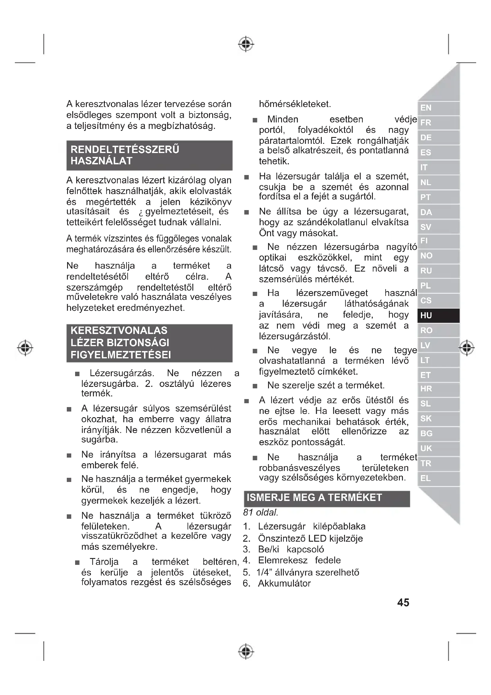 A keresztvonalas lézer tervezése során elsĘdleges szempont volt a biztonság, a teljesítmény és a megbízhatóság. RENDELTETÉSSZERĥ HASZNÁLAT A keresztvonalas lézert kizárólag olyan felnĘttek használhatják, akik elolvasták és megértették a jelen kézikönyv utasításait és ¿ gyelmeztetéseit, és tetteikért felelĘsséget tudnak vállalni. A termék vízszintes és függĘleges vonalak meghatározására és ellenĘrzésére készült. Ne használja a terméket a rendeltetésétĘl eltérĘ célra. A szerszámgép rendeltetéstĘl eltérĘ mĦveletekre való használata veszélyes helyzeteket eredményezhet. KERESZTVONALAS