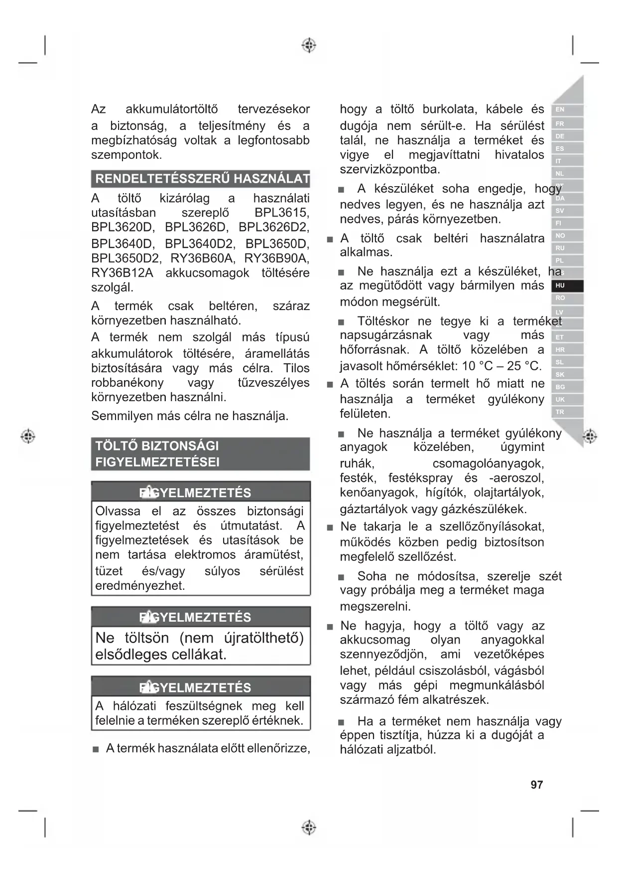 A töltő kizárólag a használati utasításban szereplő BPL3615, BPL3620D, BPL3626D, BPL3626D2, BPL3640D, BPL3640D2, BPL3650D, BPL3650D2, RY36B60A, RY36B90A, RY36B12A akkucsomagok töltésére szolgál. A termék csak beltéren, száraz környezetben használható. A termék nem szolgál más típusú akkumulátorok töltésére, áramellátás biztosítására vagy más célra. Tilos robbanékony vagy tűzveszélyes környezetben használni. Semmilyen más célra ne használja.