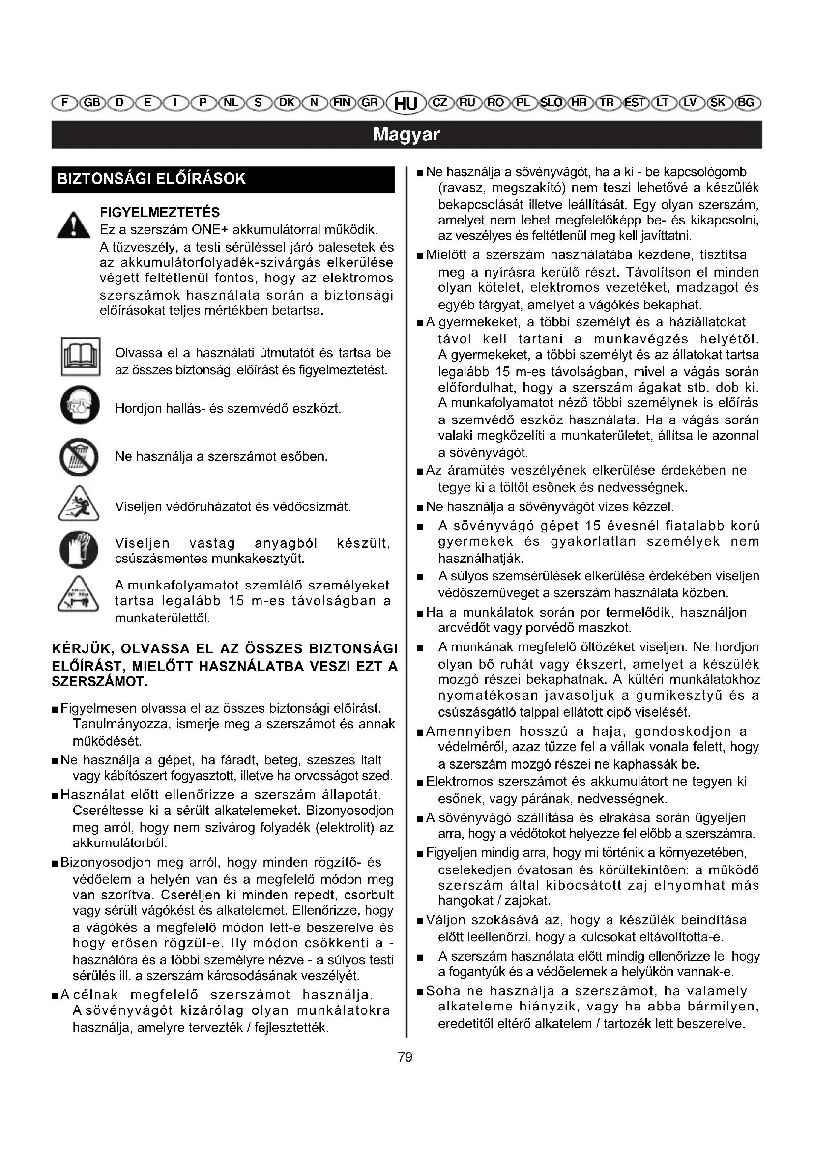 FIGYELMEZTETÉS Ez a szerszám ONE+ akkumulátorral működik. A tűzveszély, a testi sérüléssel járó balesetek és az akkumulátorfolyadék-szivárgás elkerülése végett feltétlenül fontos, hogy az elektromos szerszámok használata során a biztonsági előírásokat teljes mértékben betartsa. KÉRJÜK, OLVASSA EL AZ ÖSSZES BIZTONSÁGI ELŐÍRÁST, MIELŐTT HASZNÁLATBA VESZI EZT A SZERSZÁMOT. ■ Figyelmesen olvassa el az összes biztonsági előírást. Tanulmányozza, ismerje meg a szerszámot és annak működését. ■ Ne használja a gépet, ha fáradt, beteg, szeszes italt vagy kábítószert fogyasztott, illetve ha orvosságot szed. ■ Használat előtt ellenőrizze a szerszám állapotát. Cseréltesse ki a sérült alkatelemeket. Bizonyosodjon meg arról, hogy nem szivárog folyadék (elektrolit) az akkumulátorból. ■ Bizonyosodjon meg arról, hogy minden rögzítő- és védőelem a helyén van és a megfelelő módon meg van szorítva. Cseréljen ki minden repedt, csorbult vagy sérült vágókést és alkatelemet. Ellenőrizze, hogy a vágókés a megfelelő módon lett-e beszerelve és hogy erősen rögzül-e. Ily módon csökkenti a - használóra és a többi személyre nézve - a súlyos testi sérülés ill. a szerszám károsodásának veszélyét. ■ A célnak megfelelő szerszámot használja. A sövényvágót kizárólag olyan munkálatokra használja, amelyre tervezték / fejlesztették. ■ Ne használja a sövényvágót, ha a ki - be kapcsológomb (ravasz, megszakító) nem teszi lehetővé a készülék bekapcsolását illetve leállítását. Egy olyan szerszám, amelyet nem lehet megfelelőképp be- és kikapcsolni, az veszélyes és feltétlenül meg kell javíttatni. ■ Mielőtt a szerszám használatába kezdene, tisztítsa meg a nyírásra kerülő részt. Távolítson el minden olyan kötelet, elektromos vezetéket, madzagot és egyéb tárgyat, amelyet a vágókés bekaphat. ■ A gyermekeket, a többi személyt és a háziállatokat távol kell tartani a munkavégzés helyétől. A gyermekeket, a többi személyt és az állatokat tartsa legalább 15 m-es távolságban, mivel a vágás során előfordulhat, hogy a szerszám ágakat stb. dob ki. A munkafolyamatot néző többi személynek is előírás a szemvédő eszköz használata. Ha a vágás során valaki megközelíti a munkaterületet, állítsa le azonnal a sövényvágót. ■ Az áramütés veszélyének elkerülése érdekében ne tegye ki a töltőt esőnek és nedvességnek. ■ Ne használja a sövényvágót vizes kézzel. ■ A sövényvágó gépet 15 évesnél fiatalabb korú gyermekek és gyakorlatlan személyek nem használhatják. ■ A súlyos szemsérülések elkerülése érdekében viseljen védőszemüveget a szerszám használata közben. ■ Ha a munkálatok során por termelődik, használjon arcvédőt vagy porvédő maszkot. ■ A munkának megfelelő öltözéket viseljen. Ne hordjon olyan bő ruhát vagy ékszert, amelyet a készülék mozgó részei bekaphatnak. A kültéri munkálatokhoz nyomatékosan javasoljuk a gumikesztyű és a csúszásgátló talppal ellátott cipő viselését. ■ Amennyiben hosszú a haja, gondoskodjon a védelméről, azaz tűzze fel a vállak vonala felett, hogy a szerszám mozgó részei ne kaphassák be. ■ Elektromos szerszámot és akkumulátort ne tegyen ki esőnek, vagy párának, nedvességnek. ■ A sövényvágó szállítása és elrakása során ügyeljen arra, hogy a védőtokot helyezze fel előbb a szerszámra. ■ Figyeljen mindig arra, hogy mi történik a környezetében, cselekedjen óvatosan és körültekintően: a működő szerszám által kibocsátott zaj elnyomhat más hangokat / zajokat. ■ Váljon szokásává az, hogy a készülék beindítása előtt leellenőrzi, hogy a kulcsokat eltávolította-e. ■ A szerszám használata előtt mindig ellenőrizze le, hogy a fogantyúk és a védőelemek a helyükön vannak-e. ■ Soha ne használja a szerszámot, ha valamely alkateleme hiányzik, vagy ha abba bármilyen, eredetitől eltérő alkatelem / tartozék lett beszerelve. Olvassa el a használati útmutatót és tartsa be az összes biztonsági előírást és figyelmeztetést. Hordjon hallás- és szemvédő eszközt. Ne használja a szerszámot esőben. Viseljen védőruházatot és védőcsizmát. Viseljen vastag anyagból készült, csúszásmentes munkakesztyűt. A munkafolyamatot szemlélő személyeket tartsa legalább 15 m-es távolságban a munkaterülettől. OHT-1845_25 lgs 12/09/06 13:53 Page 7980 Magyar