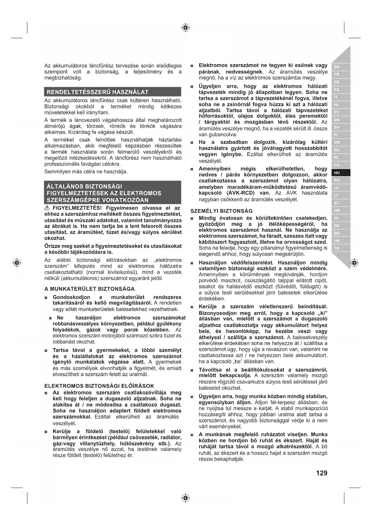 FIGYELMEZTETÉSEK A LÁNCFŰRÉSZHEZ ■ Tartsa távol a testrészeit a fűrészlánctól a láncfűrész működése közben. A láncfűrész beindítása előtt ellenőrizze, hogy a fűrészlánc nem érintkezik semmivel. Egy figyelmetlen pillanat a láncfűrész használata közben a ruházata vagy a teste fűrészláncba való beakadását okozhatja. ■ A láncfűrészt mindig jobb kézzel a hátsó fogantyút, bal kézzel pedig az elülső fogantyút fogva tartsa. A láncfűrész fordított kéz-konfigurációban való tartása növeli a személyi sérülés kockázatát, így használata tilos. 130 | Magyar■ A láncfűrészt csak a szigetelt fogófelületeknél tartsa, mert a fűrészlánc hozzáérhet rejtett vezetékekhez. A fűrészlánc „élő” vezetékkel való érintkezése következtében a szerszám fém alkatrészei áram alá kerülhetnek, minek következtében a kezelőt áramütés érheti. ■ Viseljen védőszemüveget Érdemes fül-, fej-, kéz- , lábszár- és lábfejvédő felszerelést használni. A megfelelő védőeszközök használata csökkenti a szálló por vagy a fűrészlánccal való véletlen érintkezés miatti sérülés kockázatát. ■ Ne működtesse a láncfűrészt fán, létrán, háztetőn vagy bármilyen instabil felületen. A láncfűrész ilyen használata esetén súlyos személyi sérülés történhet. ■ Mindig megfelelően támassza meg magát, és csak rögzített, szilárd és sima felületen állva használja a láncfűrészt. A csúszos vagy instabil felületek egyensúlyvesztést okozhatnak, illetve a kezelő elvesztheti az irányítást a szerszám felett. ■ Feszülő ág vágásakor figyeljen a visszarugózásra. Ha a fa feszülő rostjai felszabadulnak, a visszarugózó ág eltalálhatja a kezelőt és/vagy megdobhatja a láncfűrészt. ■ Különleges figyelemmel járjon el a kisebb bozót és facsemeték vágásakor. A kisméretű darabok beakadhatnak a fűrészláncba és kivetődhetnek a kezelő felé, vagy kilendíthetik az egyensúlyából. ■ A láncfűrészt kikapcsolt állapotban és a testétől távol tartva, az elülső fogantyúnál fogva szállítsa. A láncfűrész szállításakor vagy tároláskor mindig helyezze fel a láncvezető védőburkolatát. A láncfűrész megfelelő kezelése csökkenti a mozgó fűrészlánccal való véletlen érintkezés kockázatát. ■ Tartsa be a rúd és a lánc kenésére és cseréjére, valamint a lánc megfeszítésére vonatkozó utasításokat. A hibásan megfeszített vagy megkent lánc elszakadhat, és növeli a visszarúgás esélyét is. ■ Csak fát vágjon. Ne használja másra a láncfűrészt, mint amire szánták. Például: ne használja a láncfűrészt fém, műanyag, falazat vagy nem fából készült építőanyag vágására. A láncfűrész rendeltetéstől eltérő műveletekre való használata veszélyes helyzeteket eredményezhet. ■ Ne próbálja meg kivágni a fát, amíg nincs tisztában a felmerülő kockázatokkal és azok elkerülési módjával. Fa kivágása esetén a kezelő vagy a körülötte állók súlyosan megsérülhetnek. ■ Kövessen minden utasítást beragadt anyag kitisztításakor, a láncfűrész tárolásakor vagy javításakor. Győződjön meg róla, hogy a kapcsoló „ki” helyzetben van, és az akkumulátorcsomag nincs bent. Súlyos személyi sérülést okozhat, ha javítás vagy a beragadt anyag kitisztítása közben a láncfűrész váratlanul elindul. A VISSZARÚGÁS OKAI ÉS A KEZELŐ MEGÓVÁSA: A szerszám megugorhat, ha a működő gép orr-része valamihez hozzáér, vagy ha a vágás során a láncvezető becsípődik a fába és megszorul. A hegy érintkezése a munkadarabbal bizonyos esetekben egy hirtelen visszaható reakciót okozhat, ami a láncvezetőt felfelé és a kezelő irányába dobja. A fűrészlánc beszorulása a láncvezető felső részénél a láncvezetőt hirtelen a kezelő felé dobhatja. Minden ilyen esetben elveszítheti uralmát a láncfűrész felett, és súlyosan megsérülhet. A biztonság tekintetében ne bízzon kizárólag a láncfűrész védőelemeiben. Különböző óvintézkedéseket is kell tenni annak érdekében, hogy csökkentse a balesetek és sérülések veszélyét. A visszarúgás a szerszám helytelen használatának és/vagy a nem megfelelő használati eljárások vagy körülmények eredménye, és megelőzhető a lent megadott utasítások betartásával: ■ Erős fogást tartson, a hüvelykujja és az ujjai öleljék körbe a láncfűrész fogantyúit, mindkét keze a fűrészen legyen, és úgy helyezze a testét és a karjait, hogy lehetővé tegyék a visszarúgás erejének kivédését. A visszarúgási erőket a kezelő kontrollálhatja, ha betartja a megfelelő óvintézkedéseket. Ne hagyja, hogy a láncfűrész elszabaduljon. ■ Ne hajoljon ki túlságosan, és ne vágjon vállmagaság felett. Ezek segítenek megelőzni a hegy véletlen érintkezését és váratlan szituációkban a láncfűrész jobb irányíthatóságát teszik lehetővé. ■ Csak a gyártó által megadott pótvezetősínt és -fűrészláncot használjon. A nem megfelelő pótvezetősín és -fűrészlánc láncszakadást és/vagy visszarúgást okozhat. ■ Tartsa be a gyártó utasításait a lánc élezését és karbantartását illetően. A mélységbeállító magasságának csökkentése a visszarúgás veszélyének megnövekedését okozhatja.