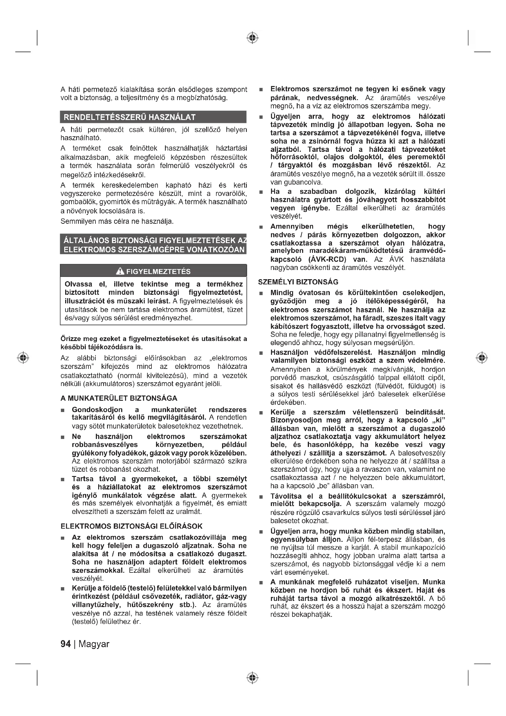FIGYELMEZTETÉSEI ■ Figyelmesen olvassa el az utasításokat. Legyen tisztában a termék kezelőszerveivel és a helyes használatával. ■ A termék használata előtt mindig ellenőrizze és szüntesse meg a szivárgásokat. ■ Mindig, minden használat előtt alaposan vizsgálja át a termék külsejét és belsejét és az összetevőket. Ellenőrizze a repedt és sérült tömlőket, szivárgásokat, eltömődött fúvókákat és hiányzó vagy sérült részeket. Ha sérült, a terméket az újbóli használat előtt meg kell javítani. A rosszul karbantartott termékek sok balesetet okoznak. 95 Magyar |