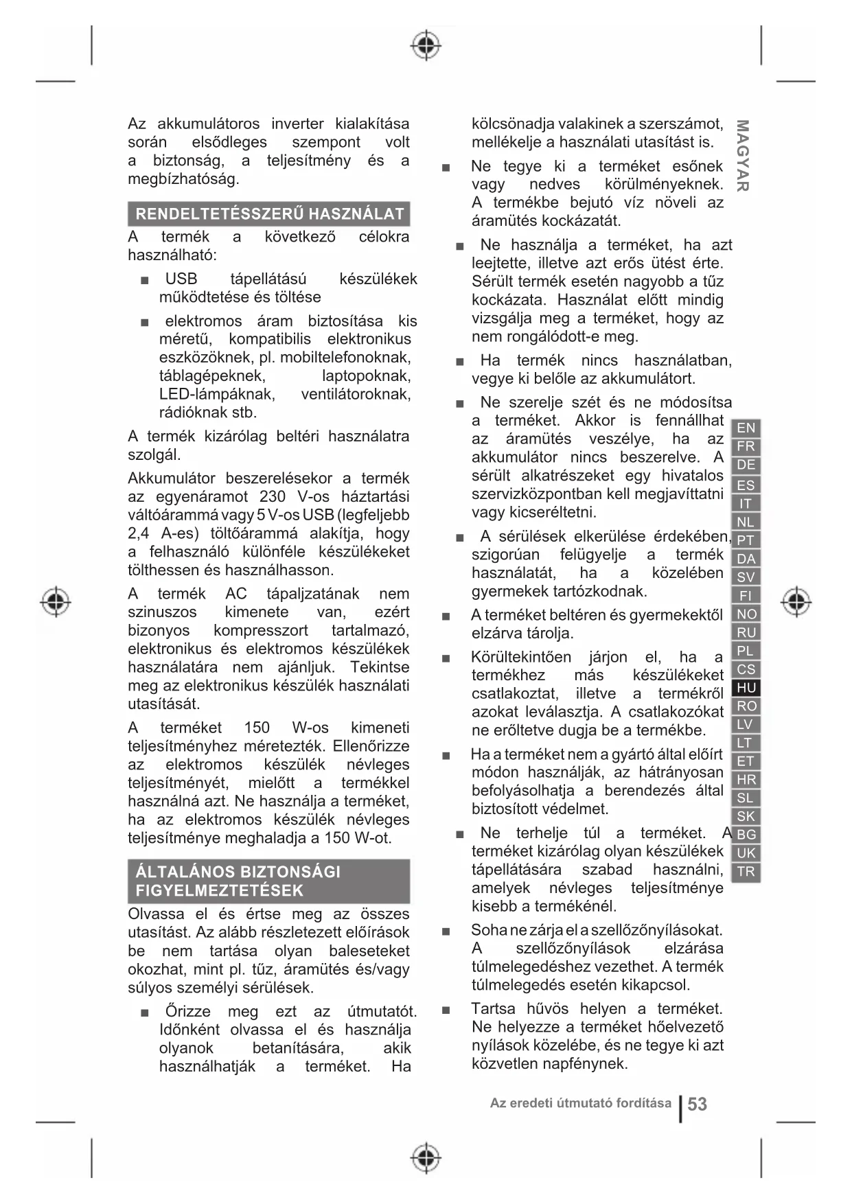 A termék a következő célokra használható: ■ USB tápellátású készülékek működtetése és töltése ■ elektromos áram biztosítása kis méretű, kompatibilis elektronikus eszközöknek, pl. mobiltelefonoknak, táblagépeknek, laptopoknak, LED-lámpáknak, ventilátoroknak, rádióknak stb. A termék kizárólag beltéri használatra szolgál. Akkumulátor beszerelésekor a termék az egyenáramot 230 V-os háztartási váltóárammá vagy 5 V-os USB (legfeljebb 2,4 A-es) töltőárammá alakítja, hogy a felhasználó különféle készülékeket tölthessen és használhasson. A termék AC tápaljzatának nem szinuszos kimenete van, ezért bizonyos kompresszort tartalmazó, elektronikus és elektromos készülékek használatára nem ajánljuk. Tekintse meg az elektronikus készülék használati utasítását. A terméket 150 W-os kimeneti teljesítményhez méretezték. Ellenőrizze az elektromos készülék névleges teljesítményét, mielőtt a termékkel használná azt. Ne használja a terméket, ha az elektromos készülék névleges teljesítménye meghaladja a 150 W-ot.