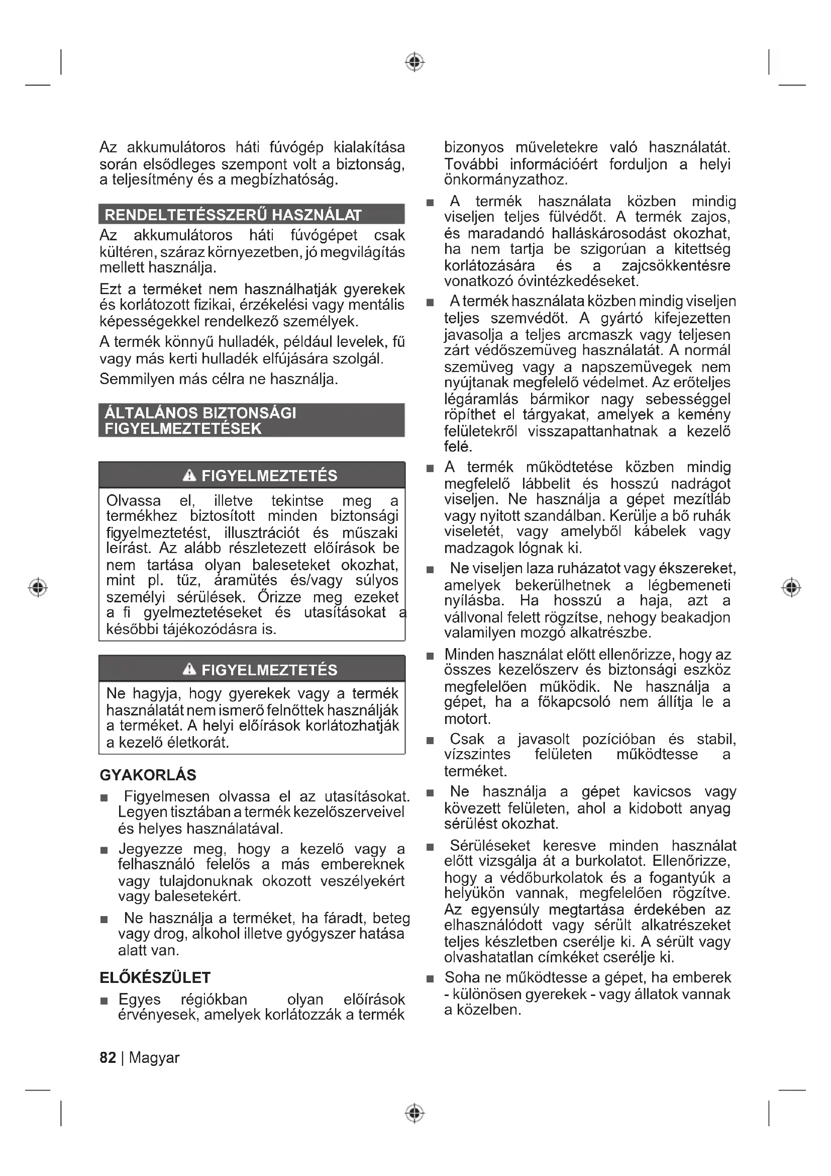 gyelmeztetést, illusztrációt és mĦszaki leírást. Az alább részletezett elĘírások be nem tartása olyan baleseteket okozhat, mint pl. tĦz, áramütés és/vagy súlyos személyi sérülések. ėrizze meg ezeket a ¿ gyelmeztetéseket és utasításokat a késĘbbi tájékozódásra is. FIGYELMEZTETÉS Ne hagyja, hogy gyerekek vagy a termék használatát nem ismerĘ felnĘttek használják a terméket. A helyi elĘírások korlátozhatják a kezelĘ életkorát. GYAKORLÁS Ŷ Figyelmesen olvassa el az utasításokat. Legyen tisztában a termék kezelĘszerveivel és helyes használatával. Ŷ Jegyezze meg, hogy a kezelĘ vagy a felhasználó felelĘs a más embereknek vagy tulajdonuknak okozott veszélyekért vagy balesetekért. Ŷ Ne használja a terméket, ha fáradt, beteg vagy drog, alkohol illetve gyógyszer hatása alatt van. ELėKÉSZÜLET Ŷ Egyes régiókban olyan elĘírások érvényesek, amelyek korlátozzák a termék bizonyos mĦveletekre való használatát. További információért forduljon a helyi önkormányzathoz. Ŷ A termék használata közben mindig viseljen teljes fülvédĘt. A termék zajos, és maradandó halláskárosodást okozhat, ha nem tartja be szigorúan a kitettség korlátozására és a zajcsökkentésre vonatkozó óvintézkedéseket. Ŷ A termék használata közben mindig viseljen teljes szemvédĘt. A gyártó kifejezetten javasolja a teljes arcmaszk vagy teljesen zárt védĘszemüveg használatát. A normál szemüveg vagy a napszemüvegek nem nyújtanak megfelelĘ védelmet. Az erĘteljes légáramlás bármikor nagy sebességgel röpíthet el tárgyakat, amelyek a kemény felületekrĘl visszapattanhatnak a kezelĘ felé. Ŷ A termék mĦködtetése közben mindig megfelelĘ lábbelit és hosszú nadrágot viseljen. Ne használja a gépet mezítláb vagy nyitott szandálban. Kerülje a bĘ ruhák viseletét, vagy amelybĘl kábelek vagy madzagok lógnak ki. Ŷ Ne viseljen laza ruházatot vagy ékszereket, amelyek bekerülhetnek a légbemeneti nyílásba. Ha hosszú a haja, azt a vállvonal felett rögzítse, nehogy beakadjon valamilyen mozgó alkatrészbe. Ŷ Minden használat elĘtt ellenĘrizze, hogy az összes kezelĘszerv és biztonsági eszköz megfelelĘen mĦködik. Ne használja a gépet, ha a fĘkapcsoló nem állítja le a motort. Ŷ Csak a javasolt pozícióban és stabil, vízszintes felületen mĦködtesse a terméket. Ŷ Ne használja a gépet kavicsos vagy kövezett felületen, ahol a kidobott anyag sérülést okozhat. Ŷ Sérüléseket keresve minden használat elĘtt vizsgálja át a burkolatot. EllenĘrizze, hogy a védĘburkolatok és a fogantyúk a helyükön vannak, megfelelĘen rögzítve. Az egyensúly megtartása érdekében az elhasználódott vagy sérült alkatrészeket teljes készletben cserélje ki. A sérült vagy olvashatatlan címkéket cserélje ki. Ŷ Soha ne mĦködtesse a gépet, ha emberek - különösen gyerekek - vagy állatok vannak a közelben. 82 | MagyarŶ A hĦtĘlevegĘ bemeneteit tartsa lerakódástól mentesen. Ne használja semmilyen eltömĘdött nyílással; tartsa tisztán a portól, szösztĘl, hajtól és bármitĘl, ami csökkentheti a légáramlást. Ŷ Szétfújás elĘtt gereblyével és seprĦvel lazítsa fel az avart. Ŷ A használat elĘtt tisztítsa meg a munkaterületet. Távolítson el minden tárgyat, úgymint köveket, törött üvegeket, szegeket, drótdarabokat és szálakat, amelyeket a nagysebességĦ levegĘ jelentĘs távolságra fújhat el. AKKUMULÁT