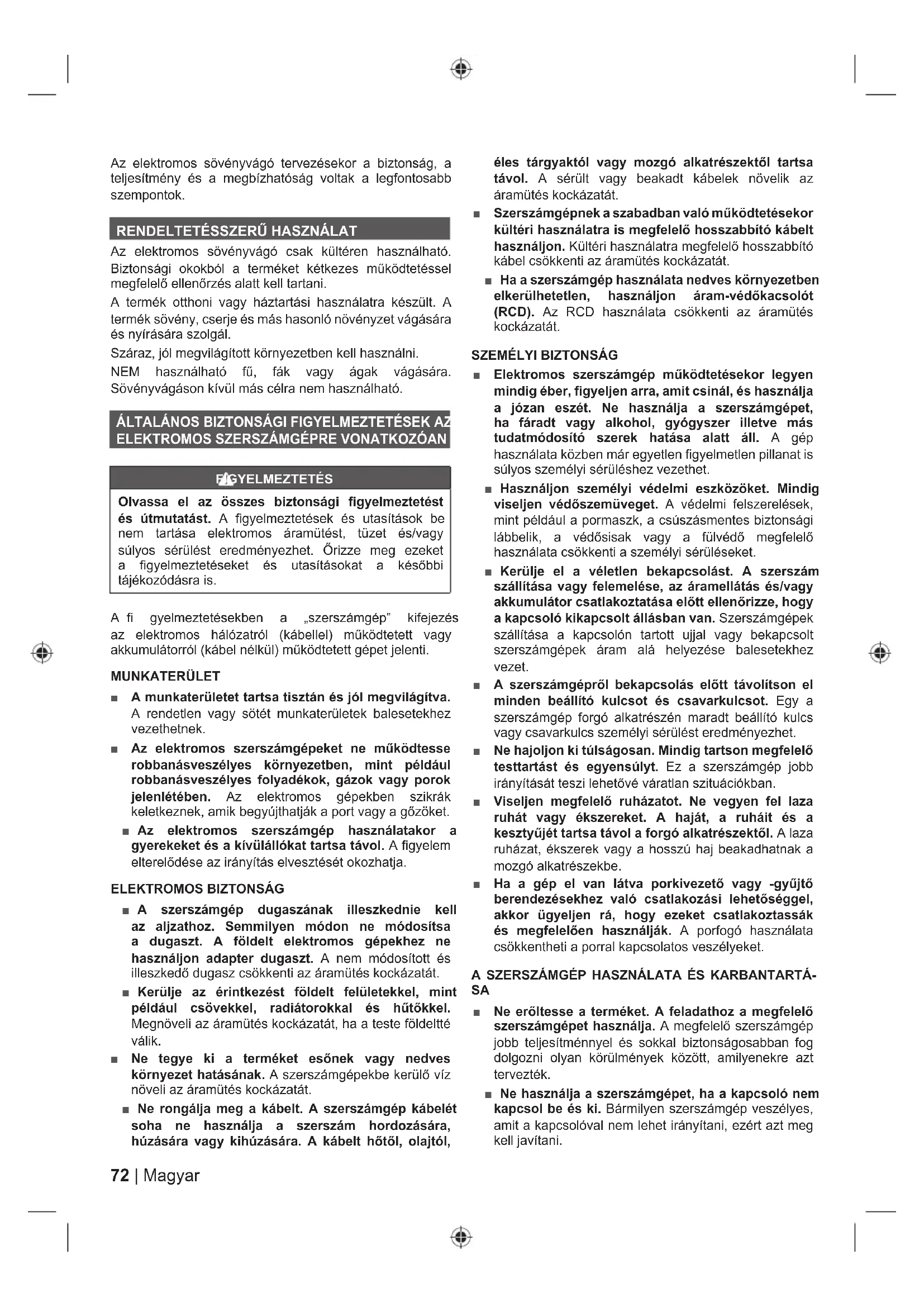 ■ Egyes régiókban olyan előírások érvényesek, amelyek korlátozzák a termék bizonyos műveletekre való használatát. További információért forduljon a helyi önkormányzathoz. Olvassa el az összes utasítást ■ A használat előtt tisztítsa meg a munkaterületet. Távolítsa el az összes tárgyat, például a kábeleket, lámpákat, drótokat vagy zsinórokat, amelyek kirepülhetnek vagy beakadhatnak a vágókésbe. ■ Ellenőrizze a sövényt idegen tárgyak, pl. drótkerítés tekintetében. ■ Különösen óvatos legyen, amikor a terméket kerítés, oszlopok, épületek vagy egyéb mozdíthatatlan tárgyak mellett használja. ■ Figyeljen a kivetett tárgyakra. A gyerekek, állatok és más személyek legyenek legalább 15 méteres távolságban. ■ Ne engedje, hogy gyerekek vagy megfelelő gyakorlattal nem rendelkező személyek használják a terméket. ■ Ne használja a gépet gyenge megvilágítás esetén. A kezelőnek tiszta rálátással kell rendelkeznie a munkaterületre, hogy azonosíthassa a potenciális veszélyeket. ■ A gép használatakor mindig ügyeljen rá, hogy minden fogantyú és védőburkolat fel legyen szerelve. Soha ne használjon hiányosan, vagy olyan terméket, melyen jogosulatlan módosítást hajtottak végre. ■ Minden használat előtt ellenőrizze, hogy az összes kezelőszerv és biztonsági eszköz megfelelően működik. Ne használja a gépet, ha a főkapcsoló nem állítja le a motort. ■ Minden használat előtt vizsgálja át a gépet. Ellenőrizze a meglazult szorítókat. Ügyeljen rá, hogy minden a védőburkolat és fogantyú megfelelően fel legyen szerelve és rögzítve. Használat előtt cserélje ki az összes sérült alkatrészt. ■ Ne alakítsa át a terméket semmilyen módon. ■ Viseljen teljes szem- és fülvédőt a termék használata közben. Kötelező a fejvédő viselete, ha olyan területen dolgozik, ahol tárgyak hullhatnak le. ■ Viseljen vastag anyagból készült hosszú nadrágot, csizmát és kesztyűt. Ne vegyen fel laza ruhát, rövid nadrágot, semmilyen ékszert, illetve ne legyen mezítláb. ■ Ha hosszú a haja, azt a vállvonal felett rögzítse, nehogy beakadjon valamilyen mozgó alkatrészbe. ■ Fülvédő viseletekor csak korlátozottan hallja a figyelmeztetéseket (riasztást vagy kiáltást). A kezelőnek jobban oda kell figyelnie arra, hogy mi folyik a munkaterületen. ■ Hasonló gépek egymás közelében történő használata növeli a halláskárosodás veszélyét, valamint annak veszélyét, hogy más személyek lépnek be az Ön munkaterületére. ■ Ne használja a terméket, ha fáradt, beteg vagy alkohol, gyógyszerek, illetve más tudatmódosítók hatása alatt áll.74 | Magyar ■ Stabilan álljon és vegyen fel megfelelő egyensúlyt. Ne hajoljon ki túlságosan. A túlzott kinyúlás egyensúlyvesztést és súlyos sérülést eredményezhet. ■ A testrészeit tartsa távol a mozgó alkatrészektől. ■ A gép bekapcsolása előtt győződjön meg róla, hogy a vágókések semmivel nem fognak érintkezni. ■ A sövényvágót használat közben mindig a két fogantyúnál fogja mindkét kezével, és vigyázzon arra, hogy biztonságos és stabil legyen a testhelyzete a használat közben. A gyártó nem javasolja fellépők vagy létrák használatát. Ha a magasban kell vágni, használjon nagyobb hatótávolságú gépet. ■ A kések élesek. A késszerelvény kezelésekor viseljen csúszásmentes, nehéz igénybevételre tervezett védőkesztyűt. Az ujjait vagy a kezét ne tegye a kések közé vagy bármilyen más pozícióba, ahol becsípődhetnek vagy levághatja azokat. ■ A következő műveletek előtt a terméket mindig állítsa le, válassza le a tápellátásról, győződjön meg arról, hogy minden mozgó alkatrész megállt, és hagyja a terméket lehűlni: ● a vágóeszköz működési pozíciójának beállítása ● tisztítás vagy eltömődés megszüntetése ● a termék felügyelet nélkül hagyása ● ellenőrzi, karbantartja vagy dolgozik a terméken ■ Sűrű bokrokon soha ne erőltesse a sövényvágót. Ez a kések beakadását és a lelassulását okozhatja. Ha a kés lelassult, csökkentse a haladási sebességét. ■ Ne próbáljon olyan ágakat vagy tüskéket elvágni, amelyek vastagabbak 22 mm-nél, és olyanokat sem, amiket nem lehet „megetetni” a vágókéssel. A vastagabb ágakat egy kézifűrész vagy ágazófűrész segítségével vágja le. ■ Ne használja a gépet sérült vagy túlságosan elhasználódott vágóeszközzel. FIGYELMEZTETÉS Ha a gép leesett, erős ütést kapott vagy rendellenesen kezd vibrálni, azonnal állítsa le a gépet, és vizsgálja át sérülések tekintetében vagy azonosítsa a vibráció okát. Minden sérülést hivatalos szervizközpontban kell megjavíttatni vagy kicseréltetni. ■ A készüléket egy 30 mA-nél nem nagyobb kioldóáramú áram-védőkapcsolóval (RCD) kell felszerelni. ■ Ha hosszabbító kábelt kell használnia, ügyeljen arra, hogy az kültéri használatra alkalmas és a termék meghajtásához elégséges teljesítményű legyen. Sérülés tekintetében minden használat előtt vizsgálja meg. Használatkor mindig tekerje szét, mert a feltekert kábelek túlhevülhetnek. ■ Minden használat előtt sérülés tekintetében vizsgálja át a tápkábelt. Ha sérülés jelei látszanak, a veszély elkerülése érdekében egy képzett szakemberrel vagy hivatalos szervizközpontban kell kicseréltetni.