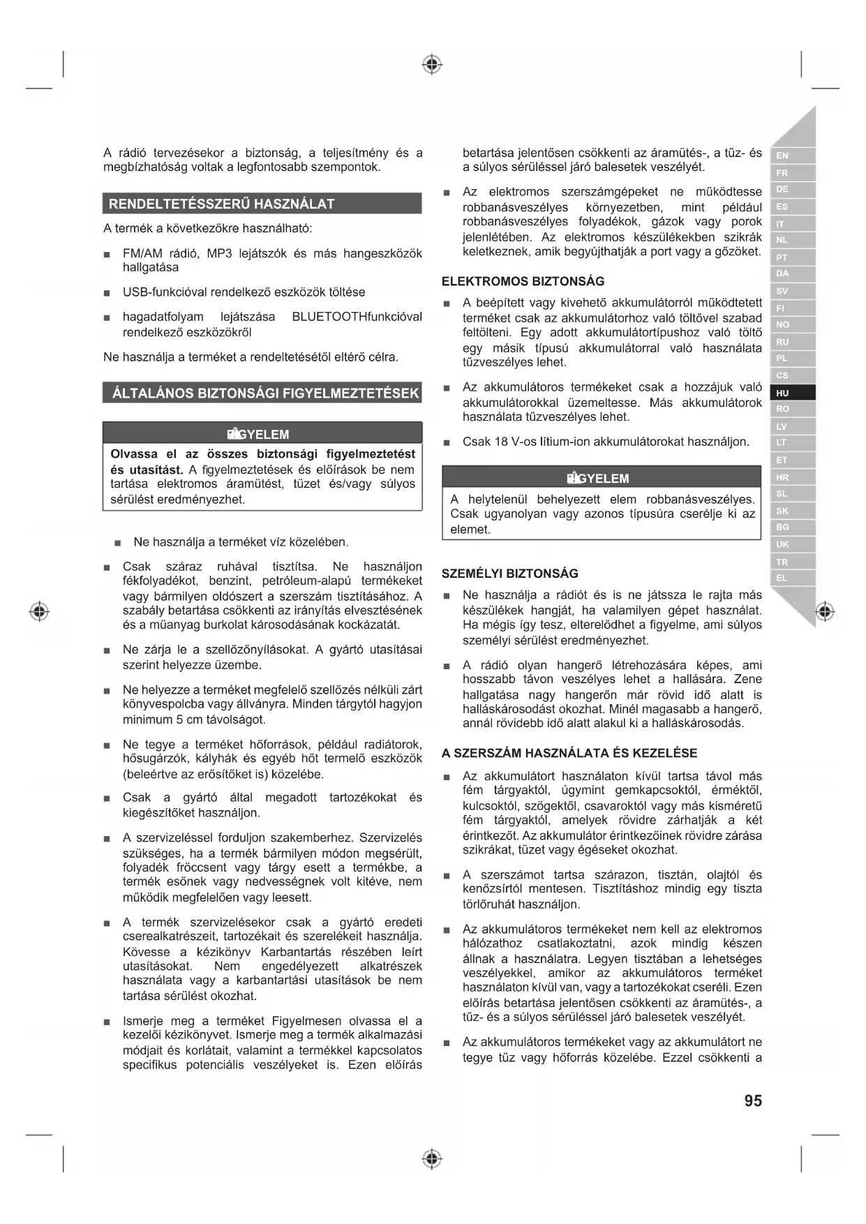 gyelmetlenség is elegendő ahhoz, hogy súlyosan megsérüljön. FIGYELEM Az alkatrészek összeszerelésekor, tisztításkor vagy használaton kívül mindig vegye ki az akkumulátort a termékből. Ezen energiaforrások kivétele megakadályozza a véletlen bekapcsolódást, ami komoly személyi sérülést okozhat. FIGYELEM A termék nem vízálló. Ne merítse folyadékba a terméket. Ezen fi gyelmeztetés fi gyelmen kívül hagyása súlyos személyi sérülést eredményezhet. VIGYÁZAT Mindig ellenőrizze a kézikönyvben a tartozékként vagy kiegészítőként való használatra javasolt eszközöket. A termékhez csatlakoztatott bármilyen eszköz megfelelő használata a kezelő felelőssége. A helytelen használat károsíthatja az eszközt vagy a terméket. FIGYELEM A rádió olyan hangerő létrehozására képes, ami hosszabb távon veszélyes lehet a hallására. Zene hallgatása nagy hangerőn már rövid idő alatt is halláskárosodást okozhat. Minél magasabb a hangerő, annál rövidebb idő alatt alakul ki a halláskárosodás. AZ AAA