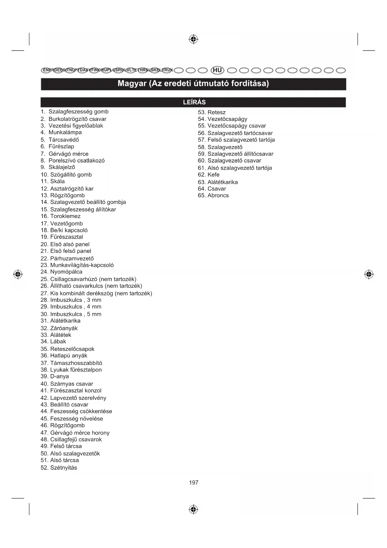 Leírás Menny Alátétek 7 Asztalrögzítő kar 1 Imbuszkulcs , 3 mm 1 Imbuszkulcs , 4 mm 1 Imbuszkulcs , 5 mm 1 Gérvágó mérce 1 Acorn anyák 4 Lábak 4 Fűrészasztal 1 Reteszelőcsapok 2 Hatlapú anyák 2 Hosszabbító támasz 1 Párhuzamvezető 1 Nyomópálca 1 Használati utasítás 1 ÖSSZESZERELÉS KICSOMAGOLÁS A terméket össze kell szerelni. ■ Óvatosan emelje ki a terméket a dobozból és helyezze egy vízszintes munkafelületre. FIGYELEM Ne használja ezt a terméket, ha a Különálló alkatrészek listáján levő bármelyik alkatrész már fel van szerelve a termékre a kicsomagoláskor. Az ezen a listán lévő alkatrészeket a gyártó nem szereli fel a termékre, ezeket az ügyfélnek kell felszerelnie. A nem megfelelően összeszerelt termék használata súlyos személyi sérüléshez vezethet. ■ Ellenőrizze gondosan az eszközt, ellenőrizze, hogy nem volt-e törés vagy sérülés a szállítás során. MEGJEGYZÉS: A fűrészt kilazított fűrészszalaggal szállítják. Csak a szalagfeszesség megfelelő beállítását követően kapcsolja be a fűrészt. ■ Csak az eszköz gondos átvizsgálását és a termék megfelelő üzemeltetését követően dobja el a csomagolóanyagot. ■ Ha hiányzik vagy megrongálódott egy alkatrész, hívja fel a legközelebbi hivatalos szervizközpontot. FIGYELEM Ha valamelyik alkatrész sérült vagy hiányzik, ne működtesse a terméket, amíg az alkatrészt ki nem cseréli. Ha a terméket sérült vagy hiányzó alkatrészekkel működteti, súlyos személyi sérülést okozhat. FIGYELEM Ne próbálja átalakítani a szerszámot, sem pedig olyan kiegészítőket alkalmazni, amelyeknek szerszámmal való használata nem javasolt. Az ilyen módosítás vagy megváltoztatás helytelen használatnak minősül és veszélyes körülményeket eredményezhet, amelyek komoly személyi sérüléshez vezethetnek. FIGYELEM A tápellátást csak a teljes összeszerelést követően csatlakoztassa a termékhez. Ennek gyelmen kívül hagyása véletlenszerű elindítást és esetleg súlyos személyi sérülést okozhat. A TERMÉK FELSZERELÉSE A MUNKAPADRA Ha a terméket egy állandó helyen fogják használni, akkor szerelje egy szilárd felületre, például egy munkapadra. Erre a célra négy csavarhely van kialakítva a fűrész talpán. A csavarok (nem tartozék) kellő hosszúságúak legyenek ahhoz, hogy átérjék a fűrész talpát, a biztosító alátéteket (nem tartozék), hatlapú anyákat és a munkalap vastagságát. Húzza meg mind a négy csavart. A szerelés után gondosan ellenőrizze a munkapadot, hogy biztosan ne mozduljon el a használat során. Ha bármilyen billenést, csúszást, elmozdulást vesz észre, rögzítse a munkapadot a padlóhoz mielőtt működtetné a terméket. ■ Helyezze a terméket a munkapadra. A fűrész talpát mintaként használva jelölje meg a lyukakat, ahova a terméket felszereli. ■ Fúrja át a munkapadot. ■ Helyezze a szalagfűrészt a munkapadra, összeigazítva a fűrész talpán lévő lyukakat a munkapadra fúrt lyukakkal. ■ Helyezze be a csavarokat (nem tartozék), és szorítsa meg a biztosító alátétekkel és a hatlapú anyákkal (nem tartozék). MEGJEGYZÉS: az összes csavart felülről kell behelyezni. Szerelje fel a biztosító alátéteket és a hatlapú anyákat pad alatt.203 Magyar (Az eredeti útmutató fordítása)