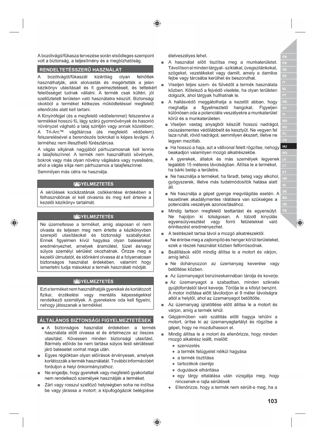 A bozótvágót/fűkaszát kizárólag olyan felnőttek használhatják, akik elolvasták és megértették a jelen kézikönyv utasításait és fi gyelmeztetéseit, és tetteikért felelősséget tudnak vállalni. A termék csak kültéri, jól szellőztetett területen való használatra készült. Biztonsági okokból a terméket kétkezes működtetéssel megfelelő ellenőrzés alatt kell tartani. A fűnyírófejjel (és a megfelelő védőelemmel) felszerelve a termékkel hosszú fű, lágy szárú gyomnövények és hasonló növényzet vágható a talaj szintjén vagy annak közelében. A Tri-Arc™ vágótárcsa (és megfelelő védőelem) felszerelésével a berendezés bokrokat is képes levágni. A terméhez nem illeszthető fűrésztárcsa. A vágás síkjának nagyjából párhuzamosnak kell lennie a talajfelszínnel. A termék nem használható sövények, bokrok vagy más olyan növény vágására vagy nyesésére, ahol a vágás síkja nem párhuzamos a talajfelszínnel. Semmilyen más célra ne használja. FIGYELMEZTETÉS A sérülések kockázatának csökkentése érdekében a felhasználónak el kell olvasnia és meg kell értenie a kezelői kézikönyv tartalmát. FIGYELMEZTETÉS Ne üzemeltesse a terméket, amíg alaposan el nem olvasta és teljesen meg nem értette a kézikönyvben szereplő utasításokat és biztonsági szabályokat. Ennek figyelmen kívül hagyása olyan baleseteket eredményezhet, amelyek áramütést, tüzet és/vagy súlyos személyi sérülést okozhatnak. Őrizze meg a kezelői útmutatót, és időnként olvassa át a folyamatosan biztonságos használat érdekében, valamint hogy ismertetni tudja másokkal a termék használati módját. FIGYELMEZTETÉS Ezt a terméket nem használhatják gyerekek és korlátozott fizikai, érzékelési vagy mentális képességekkel rendelkező személyek. A gyerekekre oda kell figyelni, nehogy játsszanak a termékkel.