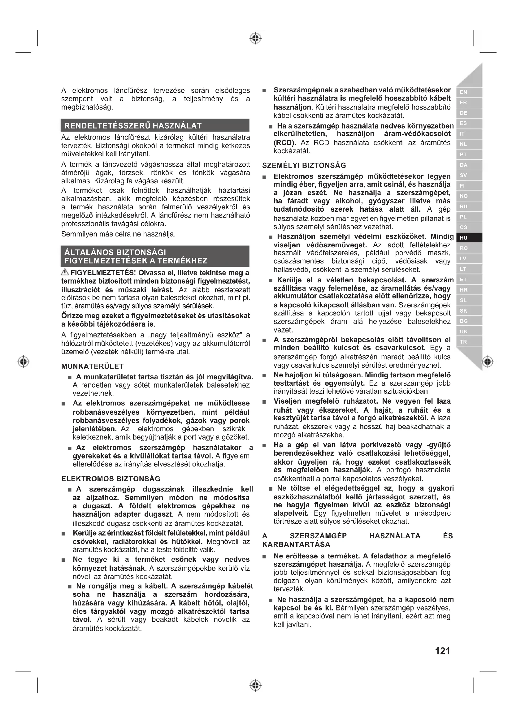 FIGYELMEZTETÉSEK A LÁNCFŰRÉSZHEZ ■ Tartsa távol a testrészeit a fűrészlánctól a láncfűrész működése közben. A láncfűrész beindítása előtt ellenőrizze, hogy a fűrészlánc nem érintkezik semmivel. Egy figyelmetlen pillanat a láncfűrész használata közben a ruházata vagy a teste fűrészláncba való beakadását okozhatja. ■ A láncfűrészt mindig jobb kézzel a hátsó fogantyút, bal kézzel pedig az elülső fogantyút fogva tartsa. A láncfűrész fordított kéz-konfigurációban való tartása növeli a személyi sérülés kockázatát, így használata tilos. ■ A láncfűrészt csak a szigetelt fogófelületnél tartsa, mert a fűrészlánc rejtett vezetékekhez vagy a saját vezetékéhez is hozzáérhet. Ha a fűrészlánc feszültség alatt álló vezetékkel érintkezik, akkor a láncfűrész külvilággal érintkező fémrészei is áram alá kerülhetnek, és megrázhatják a kezelőt. ■ Viseljen védőszemüveget Érdemes fül-, fej-, kéz- , lábszár- és lábfejvédő felszerelést használni. A megfelelő védőeszközök használata csökkenti a szálló por vagy a fűrészlánccal való véletlen érintkezés miatti sérülés kockázatát. ■ Ne működtesse a láncfűrészt fán, létrán, háztetőn vagy bármilyen instabil felületen. A láncfűrész ilyen használata esetén súlyos személyi sérülés történhet. ■ Mindig megfelelően támassza meg magát, és csak rögzített, szilárd és sima felületen állva használja a láncfűrészt. A csúszos vagy instabil felületek egyensúlyvesztést okozhatnak, illetve a kezelő elvesztheti az irányítást a szerszám felett. ■ Feszülő ág vágásakor figyeljen a visszarugózásra. Ha a fa feszülő rostjai felszabadulnak, a visszarugózó ág eltalálhatja a kezelőt és/vagy megdobhatja a láncfűrészt. ■ Különleges figyelemmel járjon el a kisebb bozót és facsemeték vágásakor. A kisméretű darabok beakadhatnak a fűrészláncba és kivetődhetnek a kezelő felé, vagy kilendíthetik az egyensúlyából. ■ A láncfűrészt kikapcsolt állapotban és a testétől távol tartva, az elülső fogantyúnál fogva szállítsa. A láncfűrész szállításakor vagy tároláskor mindig helyezze fel a láncvezető védőburkolatát. A láncfűrész megfelelő kezelése csökkenti a mozgó fűrészlánccal való véletlen érintkezés kockázatát. ■ Tartsa be a rúd és a lánc kenésére és cseréjére, valamint a lánc megfeszítésére vonatkozó utasításokat. A hibásan megfeszített vagy megkent lánc elszakadhat, és növeli a visszarúgás esélyét is. ■ Csak fát vágjon. Ne használja másra a láncfűrészt, mint amire szánták. Például: ne használja a láncfűrészt fém, műanyag, falazat vagy nem fából készült építőanyag vágására. A láncfűrész rendeltetéstől eltérő műveletekre való használata veszélyes helyzeteket eredményezhet. ■ Ne próbálja meg kivágni a fát, amíg nincs tisztában a felmerülő kockázatokkal és azok elkerülési módjával. Fa kivágása esetén a kezelő vagy a körülötte állók súlyosan megsérülhetnek. A VISSZARÚGÁS OKAI ÉS A KEZELŐ MEGÓVÁSA: A szerszám megugorhat, ha a működő gép orr-része valamihez hozzáér, vagy ha a vágás során a láncvezető becsípődik a fába és megszorul. A hegy érintkezése a munkadarabbal bizonyos esetekben egy hirtelen visszaható reakciót okozhat, ami a láncvezetőt felfelé és a kezelő irányába dobja. A fűrészlánc beszorulása a láncvezető felső részénél a láncvezetőt hirtelen a kezelő felé dobhatja. Minden ilyen esetben elveszítheti uralmát a láncfűrész felett, és súlyosan megsérülhet. A biztonság tekintetében ne bízzon kizárólag a láncfűrész védőelemeiben. Különböző óvintézkedéseket is kell tenni annak érdekében, hogy csökkentse a balesetek és sérülések veszélyét. A visszarúgás a láncfűrész hibás használatának, és/vagy helytelen működtetési eljárásainak vagy körülményeinek következménye, mely elkerülhető az alább megadott megfelelő óvintézkedések betartásával: ■ Erős fogást tartson, a hüvelykujja és az ujjai öleljék körbe a láncfűrész fogantyúit, mindkét keze a fűrészen legyen, és úgy helyezze a testét és a karjait, hogy lehetővé tegyék a visszarúgás erejének kivédését. A visszarúgási erőket a kezelő kontrollálhatja, ha betartja a megfelelő óvintézkedéseket. Ne hagyja, hogy a láncfűrész elszabaduljon.123 Magyar |