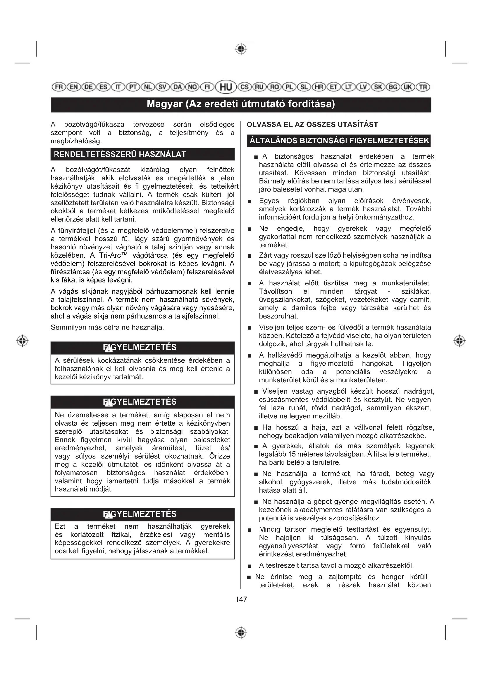 A bozótvágót/fűkaszát kizárólag olyan felnőttek használhatják, akik elolvasták és megértették a jelen kézikönyv utasításait és fi gyelmeztetéseit, és tetteikért felelősséget tudnak vállalni. A termék csak kültéri, jól szellőztetett területen való használatra készült. Biztonsági okokból a terméket kétkezes működtetéssel megfelelő ellenőrzés alatt kell tartani. A fűnyírófejjel (és a megfelelő védőelemmel) felszerelve a termékkel hosszú fű, lágy szárú gyomnövények és hasonló növényzet vágható a talaj szintjén vagy annak közelében. A Tri-Arc™ vágótárcsa (és egy megfelelő védőelem) felszerelésével bokrokat is képes levágni. A fűrésztárcsa (és egy megfelelő védőelem) felszerelésével kis fákat is képes levágni. A vágás síkjának nagyjából párhuzamosnak kell lennie a talajfelszínnel. A termék nem használható sövények, bokrok vagy más olyan növény vágására vagy nyesésére, ahol a vágás síkja nem párhuzamos a talajfelszínnel. Semmilyen más célra ne használja. FIGYELMEZTETÉS A sérülések kockázatának csökkentése érdekében a felhasználónak el kell olvasnia és meg kell értenie a kezelői kézikönyv tartalmát. FIGYELMEZTETÉS Ne üzemeltesse a terméket, amíg alaposan el nem olvasta és teljesen meg nem értette a kézikönyvben szereplő utasításokat és biztonsági szabályokat. Ennek figyelmen kívül hagyása olyan baleseteket eredményezhet, amelyek áramütést, tüzet és/ vagy súlyos személyi sérülést okozhatnak. Őrizze meg a kezelői útmutatót, és időnként olvassa át a folyamatosan biztonságos használat érdekében, valamint hogy ismertetni tudja másokkal a termék használati módját. FIGYELMEZTETÉS Ezt a terméket nem használhatják gyerekek és korlátozott fizikai, érzékelési vagy mentális képességekkel rendelkező személyek. A gyerekekre oda kell figyelni, nehogy játsszanak a termékkel. OLVASSA EL AZ ÖSSZES UTASÍTÁST
