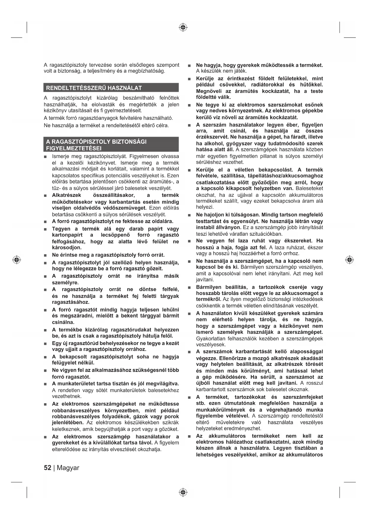 A ragasztópisztolyt kizárólag beszámítható felnőttek használhatják, ha elolvasták és megértették a jelen kézikönyv utasításait és fi gyelmeztetéseit. A termék forró ragasztóanyagok felvitelére használható. Ne használja a terméket a rendeltetésétől eltérő célra.