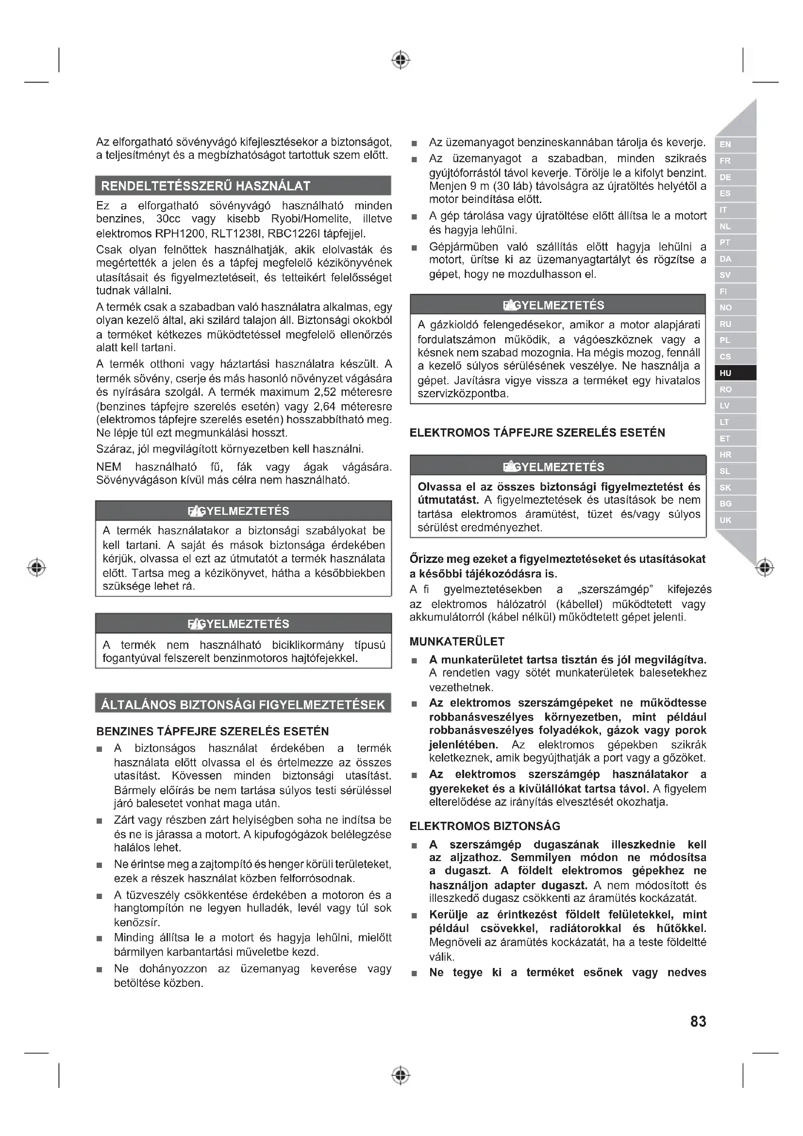 Ez a elforgatható sövényvágó használható minden benzines, 30cc vagy kisebb Ryobi/Homelite, illetve elektromos RPH1200, RLT1238I, RBC1226I tápfejjel. Csak olyan felnőttek használhatják, akik elolvasták és megértették a jelen és a tápfej megfelelő kézikönyvének utasításait és fi gyelmeztetéseit, és tetteikért felelősséget tudnak vállalni. A termék csak a szabadban való használatra alkalmas, egy olyan kezelő által, aki szilárd talajon áll. Biztonsági okokból a terméket kétkezes működtetéssel megfelelő ellenőrzés alatt kell tartani. A termék otthoni vagy háztartási használatra készült. A termék sövény, cserje és más hasonló növényzet vágására és nyírására szolgál. A termék maximum 2,52 méteresre (benzines tápfejre szerelés esetén) vagy 2,64 méteresre (elektromos tápfejre szerelés esetén) hosszabbítható meg. Ne lépje túl ezt megmunkálási hosszt. Száraz, jól megvilágított környezetben kell használni. NEM használható fű, fák vagy ágak vágására. Sövényvágáson kívül más célra nem használható. FIGYELMEZTETÉS A termék használatakor a biztonsági szabályokat be kell tartani. A saját és mások biztonsága érdekében kérjük, olvassa el ezt az útmutatót a termék használata előtt. Tartsa meg a kézikönyvet, hátha a későbbiekben szüksége lehet rá. FIGYELMEZTETÉS A termék nem használható biciklikormány típusú fogantyúval felszerelt benzinmotoros hajtófejekkel.