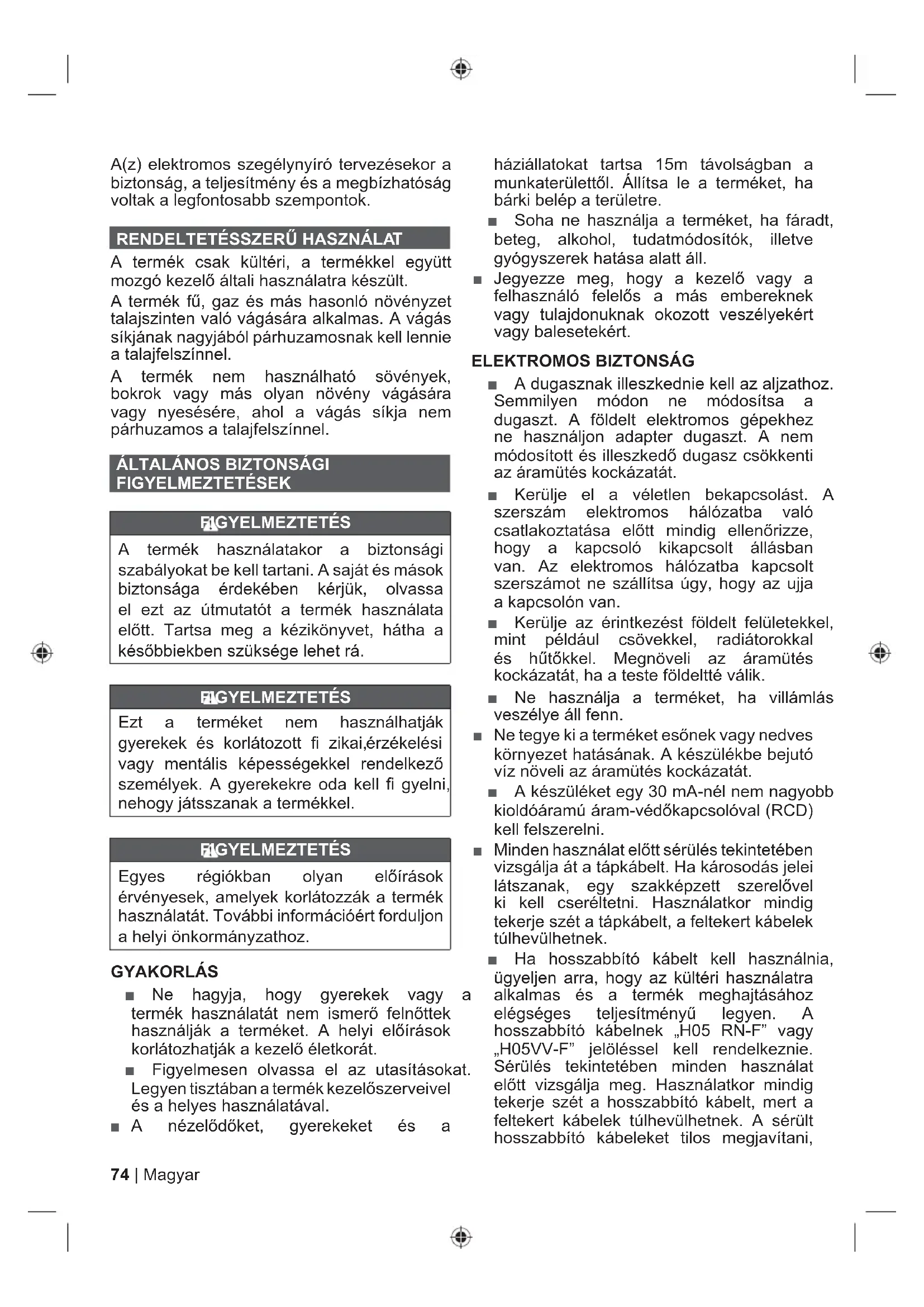 FIGYELMEZTETÉSEK FIGYELMEZTETÉS A termék használatakor a biztonsági szabályokat be kell tartani. A saját és mások biztonsága érdekében kérjük, olvassa el ezt az útmutatót a termék használata elĘtt. Tartsa meg a kézikönyvet, hátha a késĘbbiekben szüksége lehet rá. FIGYELMEZTETÉS Ezt a terméket nem használhatják gyerekek és korlátozott zikai, érzékelési vagy mentális képességekkel rendelkezĘ személyek. A gyerekekre oda kell gyelni, nehogy játsszanak a termékkel. FIGYELMEZTETÉS Egyes régiókban olyan elĘírások érvényesek, amelyek korlátozzák a termék használatát. További információért forduljon a helyi önkormányzathoz. GYAKORLÁS Ŷ Ne hagyja, hogy gyerekek vagy a termék használatát nem ismerĘ felnĘttek használják a terméket. A helyi elĘírások korlátozhatják a kezelĘ életkorát. Ŷ Figyelmesen olvassa el az utasításokat. Legyen tisztában a termék kezelĘszerveivel és a helyes használatával. Ŷ A nézelĘdĘket, gyerekeket és a háziállatokat tartsa 15m távolságban a munkaterülettĘl. Állítsa le a terméket, ha bárki belép a területre. Ŷ Soha ne használja a terméket, ha fáradt, beteg, alkohol, tudatmódosítók, illetve gyógyszerek hatása alatt áll. Ŷ Jegyezze meg, hogy a kezelĘ vagy a felhasználó felelĘs a más embereknek vagy tulajdonuknak okozott veszélyekért vagy balesetekért. ELEKTROMOS BIZT ONSÁG Ŷ A dugasznak illeszkednie kell az aljzathoz. Semmilyen módon ne módosítsa a dugaszt. A földelt elektromos gépekhez ne használjon adapter dugaszt. A nem módosított és illeszkedĘ dugasz csökkenti az áramütés kockázatát. Ŷ Kerülje el a véletlen bekapcsolást. A szerszám elektromos hálózatba való csatlakoztatása elĘtt mindig ellenĘrizze, hogy a kapcsoló kikapcsolt állásban van. Az elektromos hálózatba kapcsolt szerszámot ne szállítsa úgy, hogy az ujja a kapcsolón van. Ŷ Kerülje az érintkezést földelt felületekkel, mint például csövekkel, radiátorokkal és hĦtĘkkel. Megnöveli az áramütés kockázatát, ha a teste földeltté válik. Ŷ Ne használja a terméket, ha villámlás veszélye áll fenn. Ŷ Ne tegye ki a terméket esĘnek vagy nedves környezet hatásának. A készülékbe bejutó víz növeli az áramütés kockázatát. Ŷ A készüléket egy 30 mA-nél nem nagyobb kioldóáramú áram-védĘkapcsolóval (RCD) kell felszerelni. Ŷ Minden használat elĘtt sérülés tekintetében vizsgálja át a tápkábelt. Ha károsodás jelei látszanak, egy szakképzett szerelĘvel ki kell cseréltetni. Használatkor mindig tekerje szét a tápkábelt, a feltekert kábelek túlhevülhetnek. Ŷ Ha hosszabbító kábelt kell használnia, ügyeljen arra, hogy az kültéri használatra alkalmas és a termék meghajtásához elégséges teljesítményĦ legyen. A hosszabbító kábelnek „H05 RN-F” vagy „H05VV-F” jelöléssel kell rendelkeznie. Sérülés tekintetében minden használat elĘtt vizsgálja meg. Használatkor mindig tekerje szét a hosszabbító kábelt, mert a feltekert kábelek túlhevülhetnek. A sérült hosszabbító kábeleket tilos megjavítani,75 Magyar |