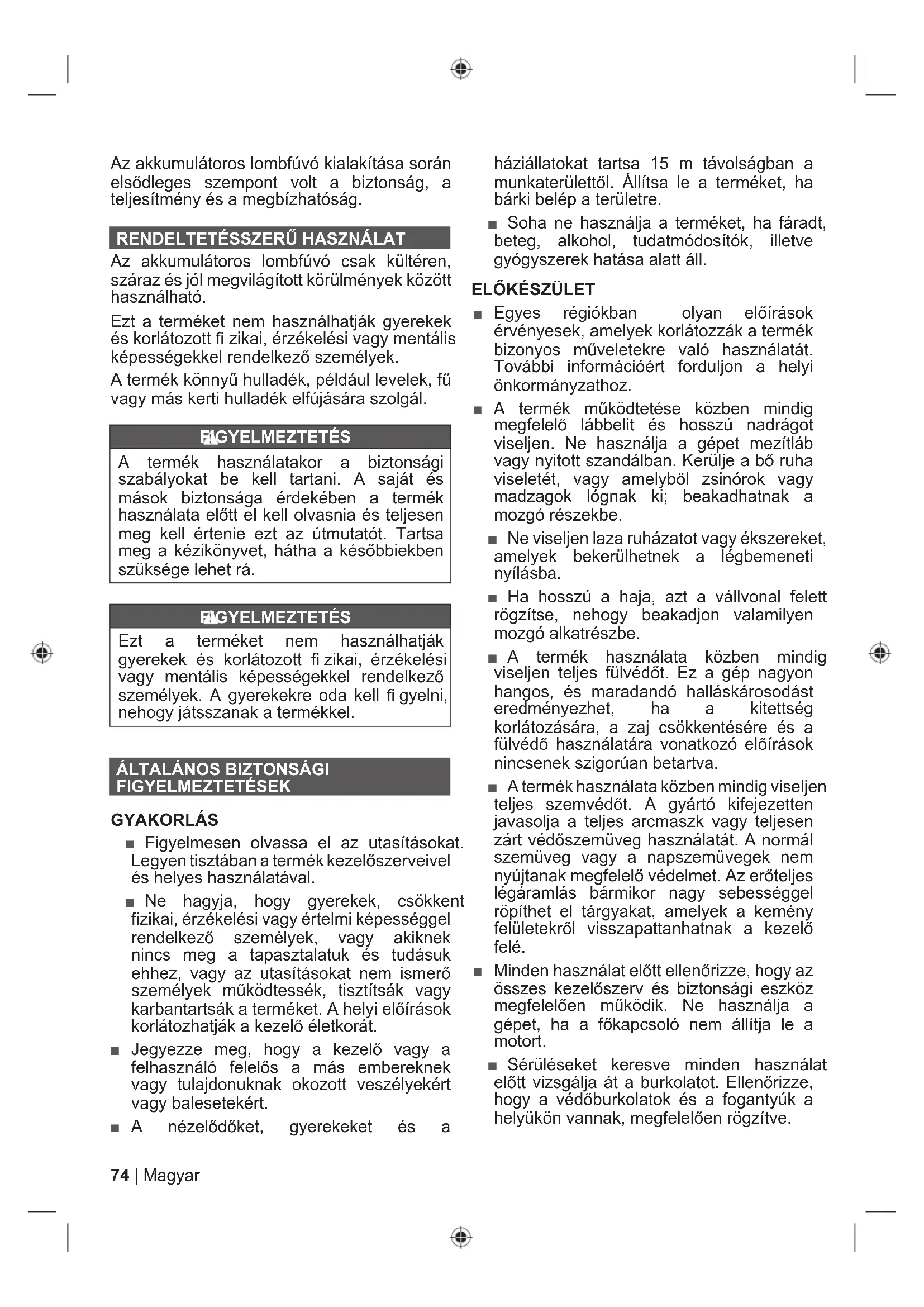 FIGYELMEZTETÉSEK GYAKORLÁS ■ Figyelmesen olvassa el az utasításokat. Legyen tisztában a termék kezelőszerveivel és helyes használatával. ■ Ne hagyja, hogy gyerekek, csökkent fizikai, érzékelési vagy értelmi képességgel rendelkező személyek, vagy akiknek nincs meg a tapasztalatuk és tudásuk ehhez, vagy az utasításokat nem ismerő személyek működtessék, tisztítsák vagy karbantartsák a terméket. A helyi előírások korlátozhatják a kezelő életkorát. ■ Jegyezze meg, hogy a kezelő vagy a felhasználó felelős a más embereknek vagy tulajdonuknak okozott veszélyekért vagy balesetekért. ■ A nézelődőket, gyerekeket és a háziállatokat tartsa 15 m távolságban a munkaterülettől. Állítsa le a terméket, ha bárki belép a területre. ■ Soha ne használja a terméket, ha fáradt, beteg, alkohol, tudatmódosítók, illetve gyógyszerek hatása alatt áll.