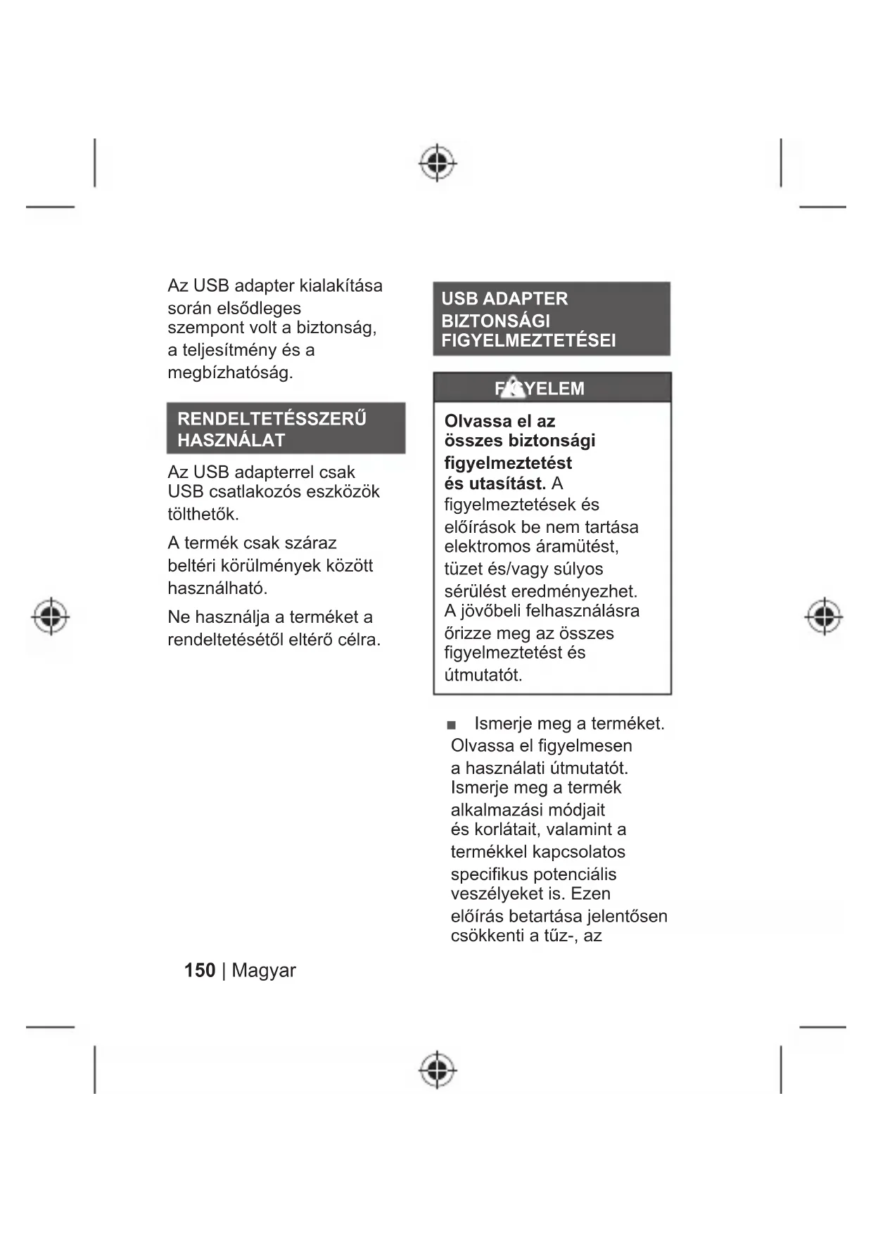 A termék csak száraz beltéri körülmények között használható. Ne használja a terméket a UHQGHOWHWpVpWĘOHOWpUĘFpOUD USB ADAPTER BIZTONSÁGI FIGYELMEZTETÉSEI FIGYELEM Olvassa el az összes biztonsági figyelmeztetést pVXWDVtWiVW A figyelmeztetések és HOĘtUiVRNEHQHPWDUWiVD elektromos áramütést, tüzet és/vagy súlyos sérülést eredményezhet. $M|YĘEHOLIHOKDV]QiOiVUD