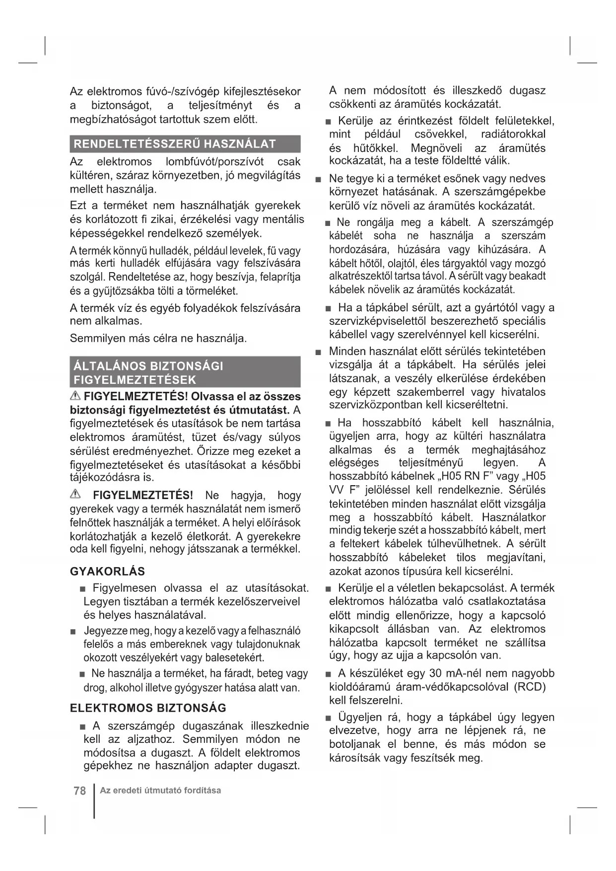 Az elektromos lombfúvót/porszívót csak kültéren, száraz környezetben, jó megvilágítás mellett használja. Ezt a terméket nem használhatják gyerekek és korlátozott fi zikai, érzékelési vagy mentális képességekkel rendelkező személyek. A termék könnyű hulladék, például levelek, fű vagy más kerti hulladék elfújására vagy felszívására szolgál. Rendeltetése az, hogy beszívja, felaprítja és a gyűjtőzsákba tölti a törmeléket. A termék víz és egyéb folyadékok felszívására nem alkalmas. Semmilyen más célra ne használja.