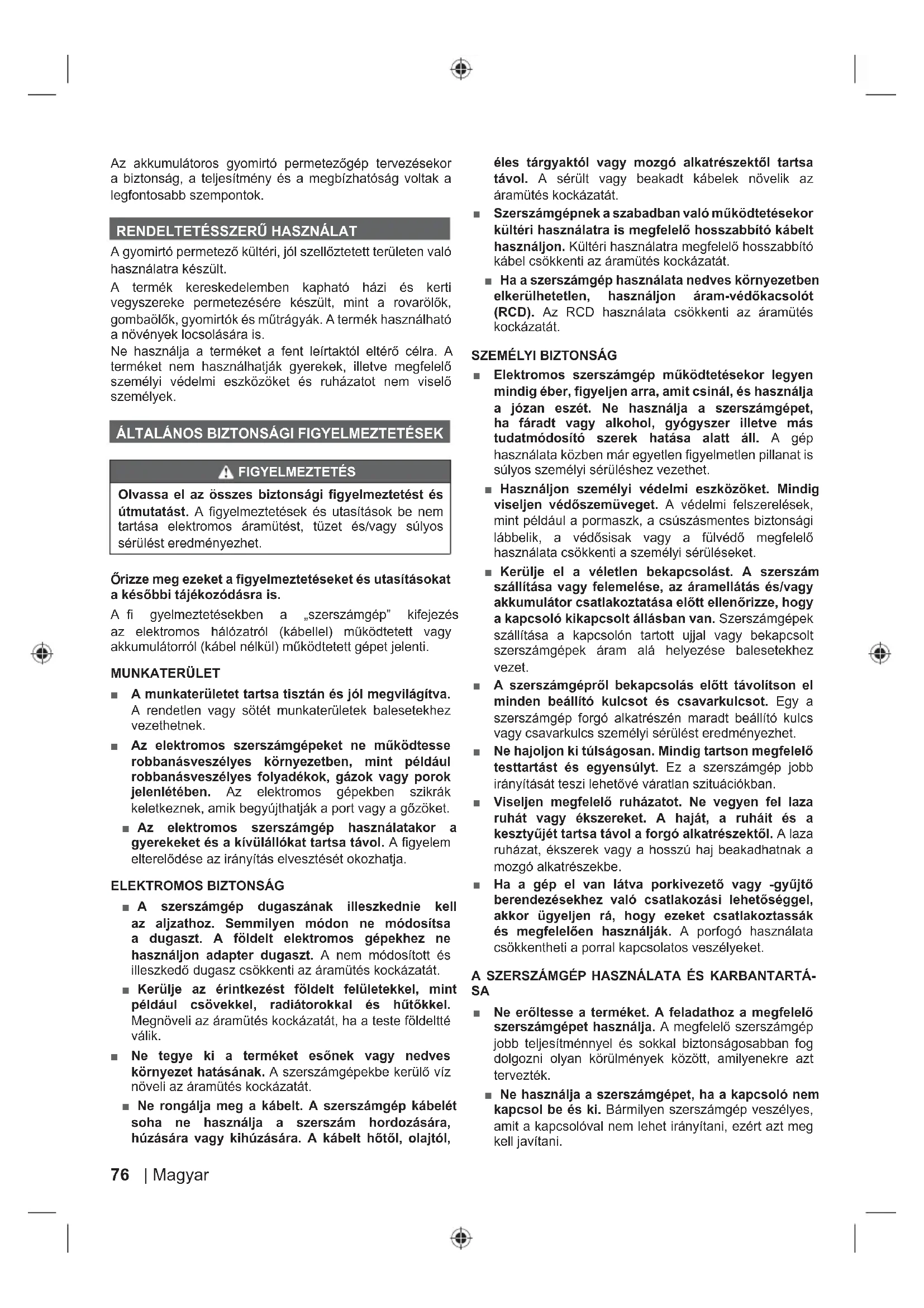 ■ Ne hagyja, hogy gyerekek, csökkent fizikai, érzékelési vagy értelmi képességgel rendelkező személyek, vagy akiknek nincs meg a tapasztalatuk és tudásuk ehhez, vagy az utasításokat nem ismerő személyek működtessék, tisztítsák vagy karbantartsák a terméket. ■ Figyeljen oda a permetezőanyaggal összefüggő veszélyekre. Bármilyen növényvédőszer vagy bármilyen más permetezőanyag termékkel való használata előtt körültekintően olvassa el az eredeti tartálon levő címkét, és kövesse az utasításokat. ■ Permetezés közben a területtől tartsa távol a nézelődőket, a gyerekeket és az állatokat. ■ A termék használata előtt ellenőrizze, hogy a lándzsa erősen rögzítve van a lándzsafogantyúhoz. Ha szükséges, fogó segítségével csatlakoztassa egymáshoz a lándzsát és a lándzsa fogantyúját. ■ Ne feledje el megfelelően felhelyezni és betekerni a permetezőtartály fedelét, miután betöltötte a folyadékot a tartályba. ■ Csak kereskedelemben kapható víz alapú pázsit- és kerti vegyszereket használjon. ■ Ne használjon kereskedelmi vegyszereket vagy vegyszereket kereskedelmi vagy ipari célokra. ■ Ne használjon maró (alkáli) öngyulladó vagy korrozív (savas) folyadékokat a termékkel. Ezek korrodálhatják a fém részeket vagy gyengíthetik a tartályt és a tömlőt. ■ Ne hagyjon maradékot vagy permetezőanyagot a permetezőtartályban a termék használata után. Minden használat után tisztítsa meg. ■ Ne öntsön forró vagy forrásban lévő folyadékot a permetezőtartályba. Ezek gyengíthetik vagy károsíthatják a tömlőt vagy a permetezőtartályt.■ Ne töltse túl a tartályt. ■ Mindig ellenőrizze a szivárgást. Ha bármilyet fedez fel, a termék használata előtt, javíttassa meg a problémát. ■ A szórási területnek jól szellőzöttnek kell lennie. ■ Mindig, minden használat előtt vizsgálja át a termék külsejét és belsejét. ■ A kipermetezendő folyadéknak víz sűrűségűnek kell lenniük. A sűrűbb folyadékok nem megfelelően permetezhetők. ■ A permetezőanyagokat előre össze kell keverni, és ha szükséges, egy tölcsér segítségével kell beönteni a permetezőtartályba. MEGJEGYZÉS: Ha nem a mérőpoharat használja mérőedényként, vagy egy tölcsérrel tölti fel a tartályt, a használat után alaposan tisztítsa meg az edényeket. A permetezőanyag előkeverésekor öblítse ki a keveréshez használt edényt. ■ Ne permetezzen, ahol szikra, láng vagy más gyújtóforrás van jelen. ■ Ne permetezzen emberek vagy háziállatok irányába. Mindig lefelé permetezzen. ■ Ne dohányozzon, egyen vagy igyon a termék használata közben. ■ Ne permetezze ki közvetlenül a bőrre. ■ Ne hagyja, hogy a permetezőanyag érintkezzen a bőrrel. Ha mégis ez történik, azonnal mossa le szappannal és bő vízzel. ■ Közvetlenül a permetezendő növényekre vagy a tárgyakra irányítsa a fúvókát. ■ Ellenőrizze, hogy az egy adott területre irányított permetezőanyagok nem károsítják a területet ■ Kerülje a szeles napokon való permetezést. A permetezőanyagok véletlenül olyan növényekre vagy tárgyakra fújhatók, melyek nem permetezhetők. ■ A permetezőanyagot tartsa távol a szemétől. Ha a permetezőanyag szembe kerül, azonnal mossa ki tiszta vízzel. Ha az irritáció továbbra is fennáll, azonnal forduljon orvoshoz. ■ A termék működtethető a bölcsőn fekvő lándzsafogantyúval vagy eltávolítható a bölcsőről, és a kezelő tarthatja a kezében. ■ Áramütés veszélye. Ne permetezzen a hálózati aljzatok irányába. ■ Minden használat után mossa meg alaposan a kezét és minden területet, ahol a bőre érintkezhetett a permettel. ■ Tartsa megfelelő állapotban a terméket. Mindig, minden használat előtt alaposan vizsgálja át a termék külsejét és belsejét és az összetevőket. Ellenőrizze a repedt és sérült tömlőket, szivárgásokat, eltömődött fúvókákat és hiányzó vagy sérült részeket. Ha sérült, a terméket az újbóli használat előtt meg kell javítani. A rosszul karbantartott termékek sok balesetet okoznak. ■ A véletlen elindítást megelőzendő a leeresztés, tisztítás vagy tárolás előtt vegye ki az akkumulátort a termékből. Azt jelzi, hogy a készülék a nemzeti követelmények sze- rinti, a kijelölt szervek által végzett rendszeres ellenőrzés tárgya lehet, ahogy azt az Európai Parlament és Tanács 2009/128/EK (2009. október 21.) „A peszticidek fenntartha- 78 | Magyar tó használatának elérését célzó közösségi fellépés keretei- nek meghatározásáról” című irányelve előírja.