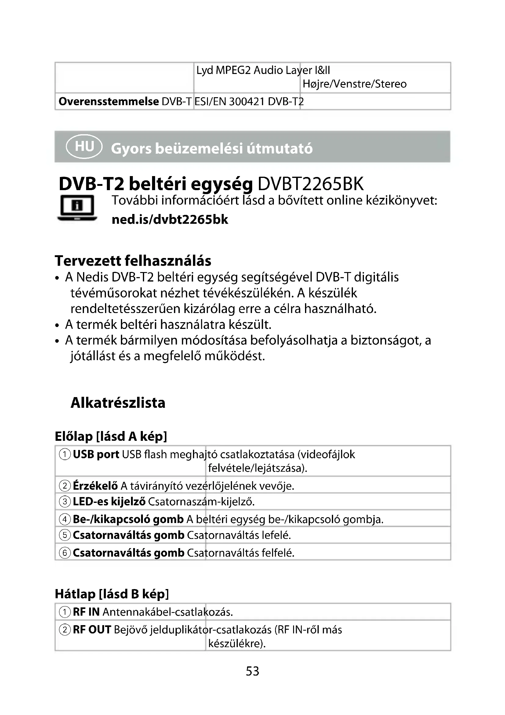 Gyors beüzemelési útmutató DVB-T2 beltéri egység DVBT2265BK További információért lásd a bővített online kézikönyvet: ned.is/dvbt2265bk Tervezett felhasználás