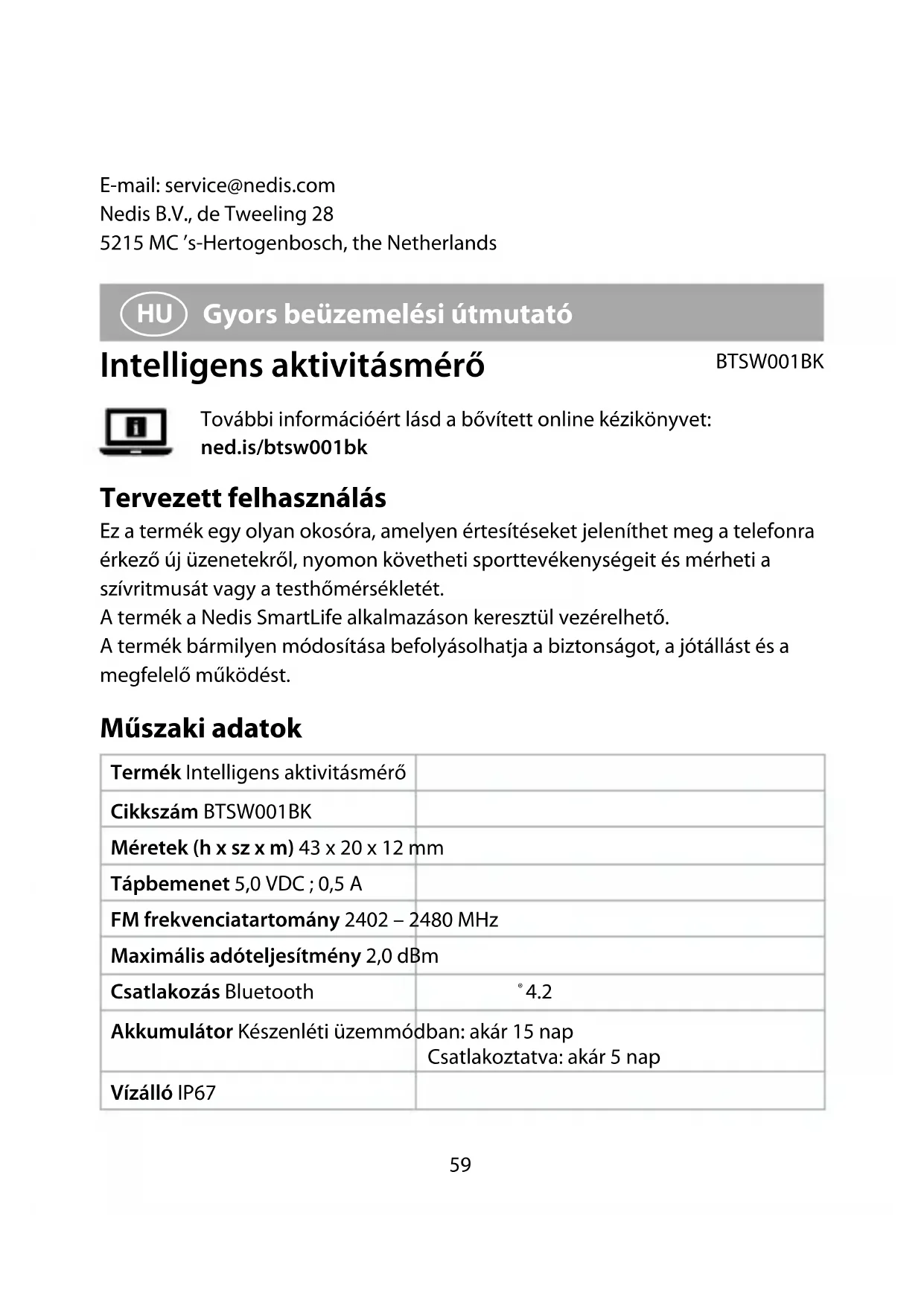 Gyors beüzemelési útmutató Intelligens aktivitásmérő BTSW001BK További információért lásd a bővített online kézikönyvet: ned.is/btsw001bk Tervezett felhasználás Ez a termék egy olyan okosóra, amelyen értesítéseket jeleníthet meg a telefonra érkező új üzenetekről, nyomon követheti sporttevékenységeit és mérheti a szívritmusát vagy a testhőmérsékletét. A termék a Nedis SmartLife alkalmazáson keresztül vezérelhető. A termék bármilyen módosítása befolyásolhatja a biztonságot, a jótállást és a megfelelő működést. Műszaki adatok Termék Intelligens aktivitásmérő Cikkszám BTSW001BK Méretek (h x sz x m) 43 x 20 x 12 mm Tápbemenet 5,0 VDC ; 0,5 A FM frekvenciatartomány 2402 – 2480 MHz Maximális adóteljesítmény 2,0 dBm Csatlakozás Bluetooth