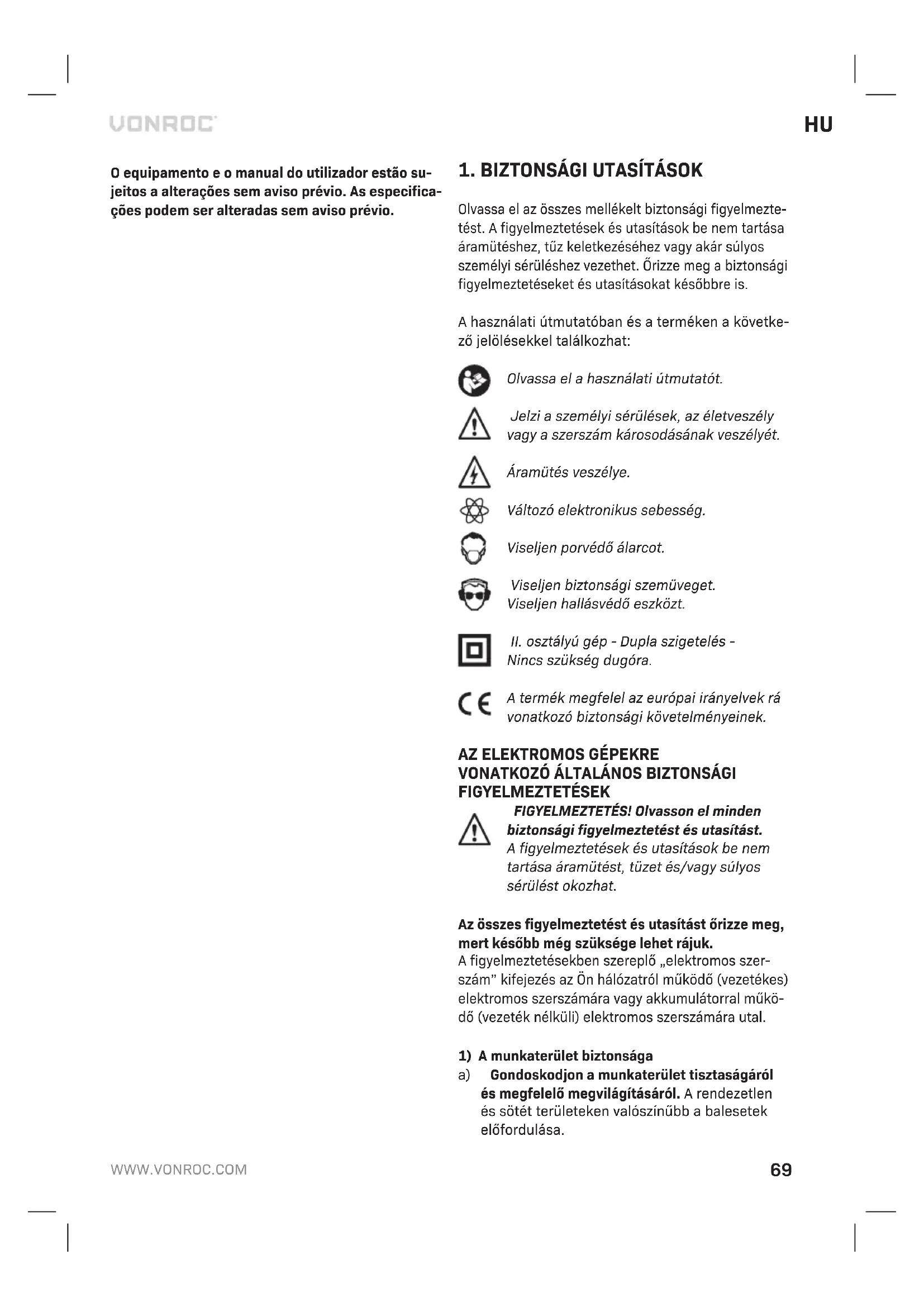 a) Gondoskodjon a munkaterület tisztaságáról és megfelelő megvilágításáról. A rendezetlen és sötét területeken valószínűbb a balesetek előfordulása. O equipamento e o manual do utilizador estão su- jeitos a alterações sem aviso prévio. As especifica- ções podem ser alteradas sem aviso prévio.70