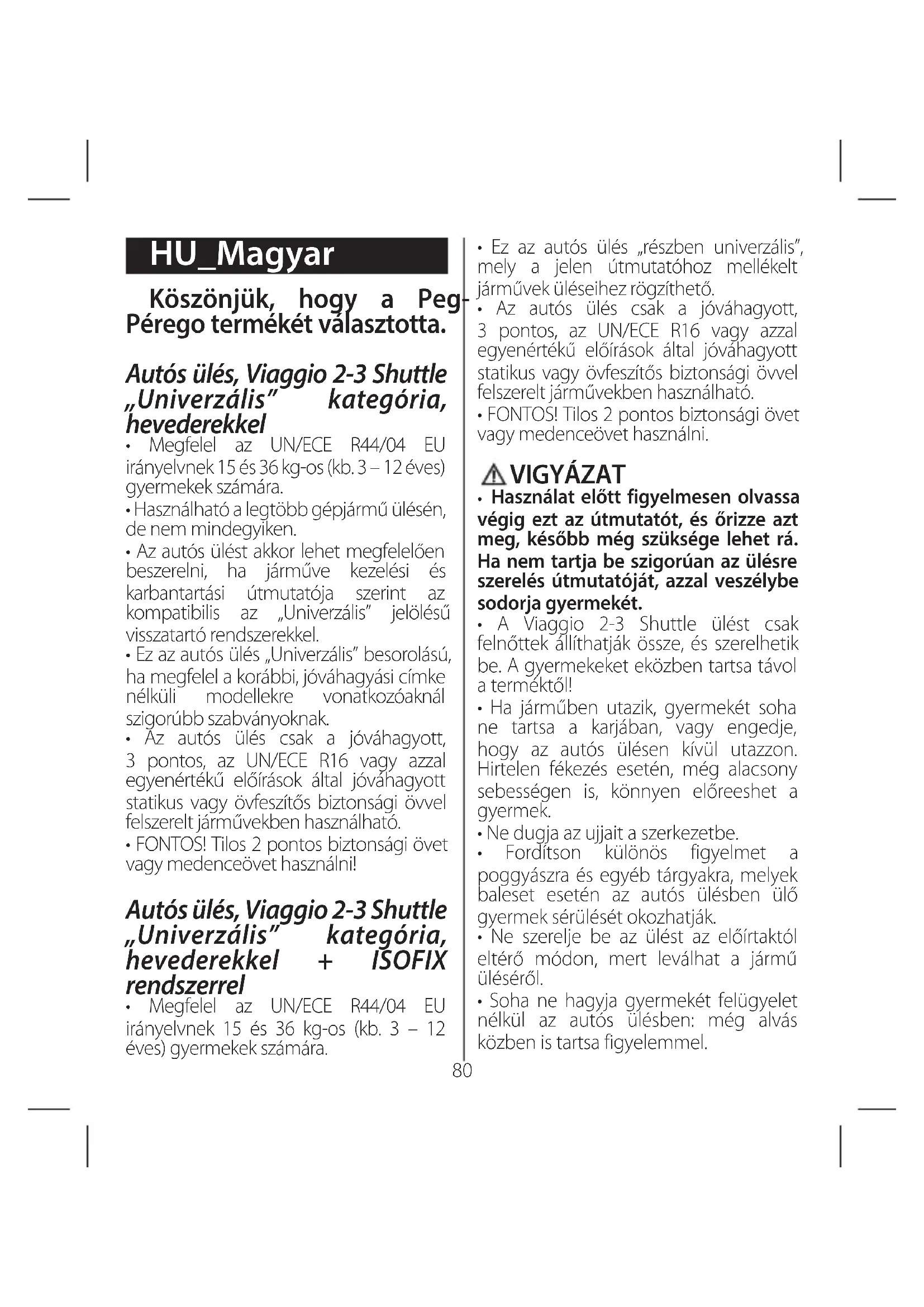 - FONTOS! Tilos 2 pontos biztonsági övet vagy medenceövet használni! Autós ülés, Viaggio 2-3 Shuttle „Univerzális” kategória, hevederekkel + ISOFIX rendszerrel
