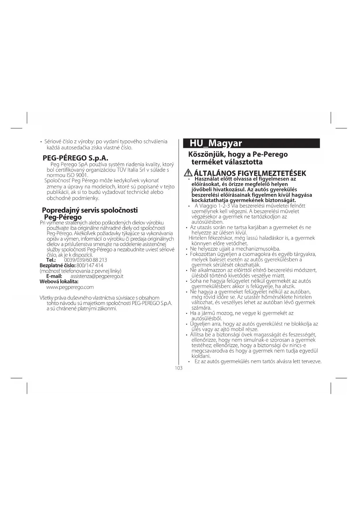 - Termé sorozatszám: a típus jóváhagyását követően minden autós ülést egyedi azonosító számmal látnak el. PEG-PÉREGO S.p.A. A Peg Perego SpA az ISO 9001 szabványnak megfelelően TÜV Italia Srl által hitelesített minőségirányítási rendszerrel rendelkezik. A Peg-Pérego az ebben a kiadványban ismertetett modelleknél műszaki vagy kereskedelmi jellegű okokból kifolyólag bármikor végrehajthat módosításokat. Peg-Pérego ügyfélszolgálat Ha a termék bármely alkatrésze elveszett, vagy megsérült, csak eredeti Peg-Pérego cserealkatrésszel pótolja. Ha javításra, cserére, a termékkel kapcsolatos110 tájékoztatásra van szüksége, vagy eredeti cserealkatrészeket és tartozékokat vásárolna, keresse a Peg-Pérego Assistance szolgálatot, és diktálja be a termék sorozatszámát, ha kéznél van. Tel.: 0039/039/60.88.213 Ingyenes hívószám: 800/147.414 (vezetékes telefonról hívható) E-mail: assistenza@pegperego.it Weboldal: www.pegperego.com A jelen kézikönyv tartalmára vonatkozóan minden szellemi tulajdonjog a PEG-PEREGO S.p.A. birtokában van, azt a hatályos törvények védik. SL_Slovenščina Zahvaljujemo se vam za izbiro izdelka Peg-Perego TEMELJNA OPOZORILA