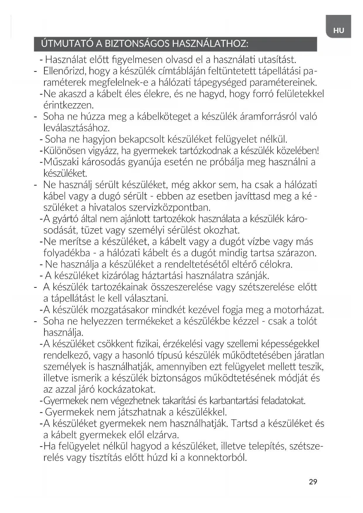 Ne merítse a készüléket, a kábelt vagy a dugót vízbe vagy más folyadékba - a hálóza kábelt és a dugót mindig tartsa szárazon. - Ne használja a készüléket a rendeltetésétől eltérő célokra. - A készüléket kizárólag háztartási használatra szánják. - A készülék tartozékainak összeszerelése vagy szétszerelése elő a tápellátást le kell választani.