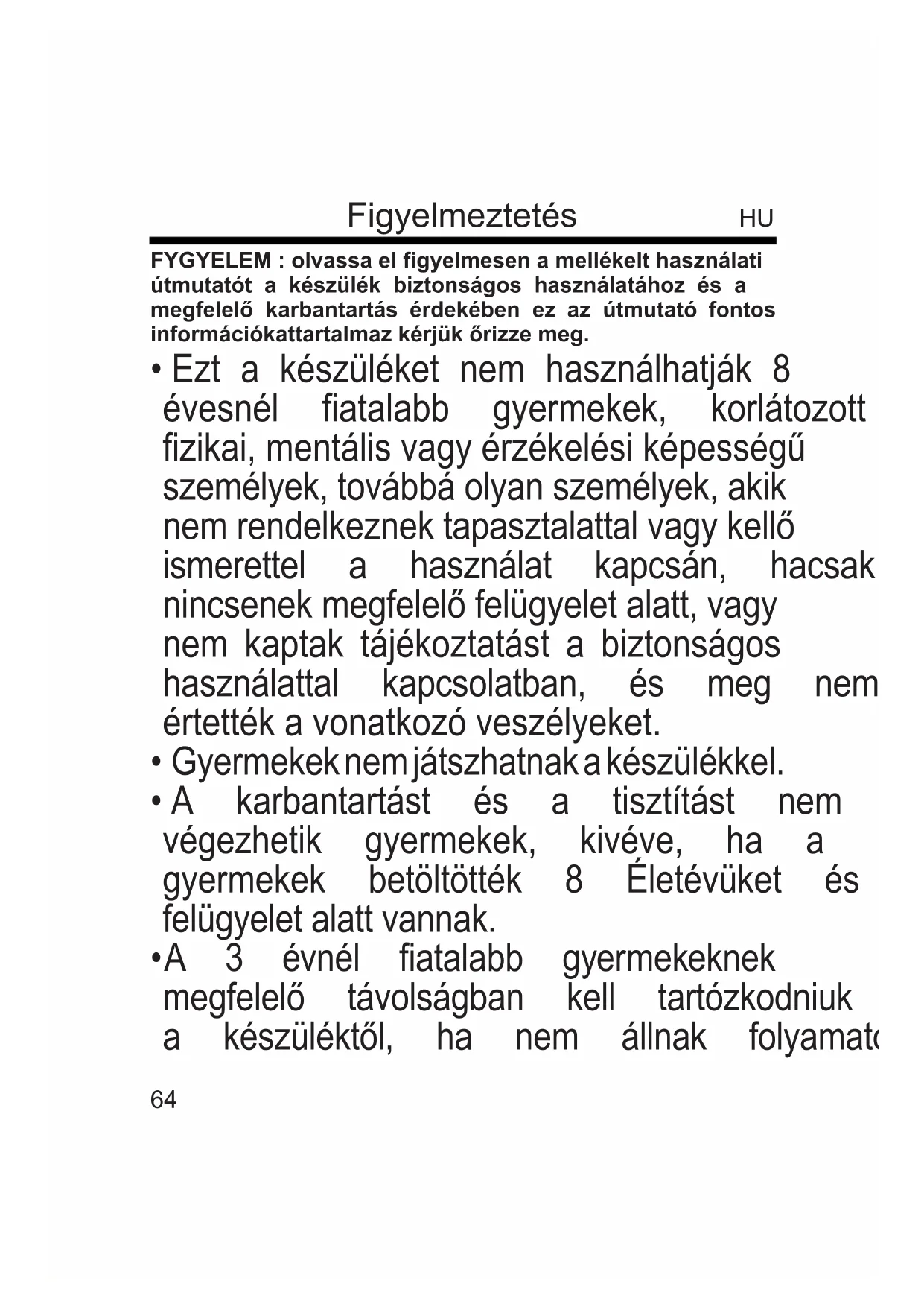 - A 3 évnél atalabb gyermekeknek megfelelő távolságban kell tartózkodniuk a készüléktől, ha nem állnak folyamatos65 felügyelet alatt.