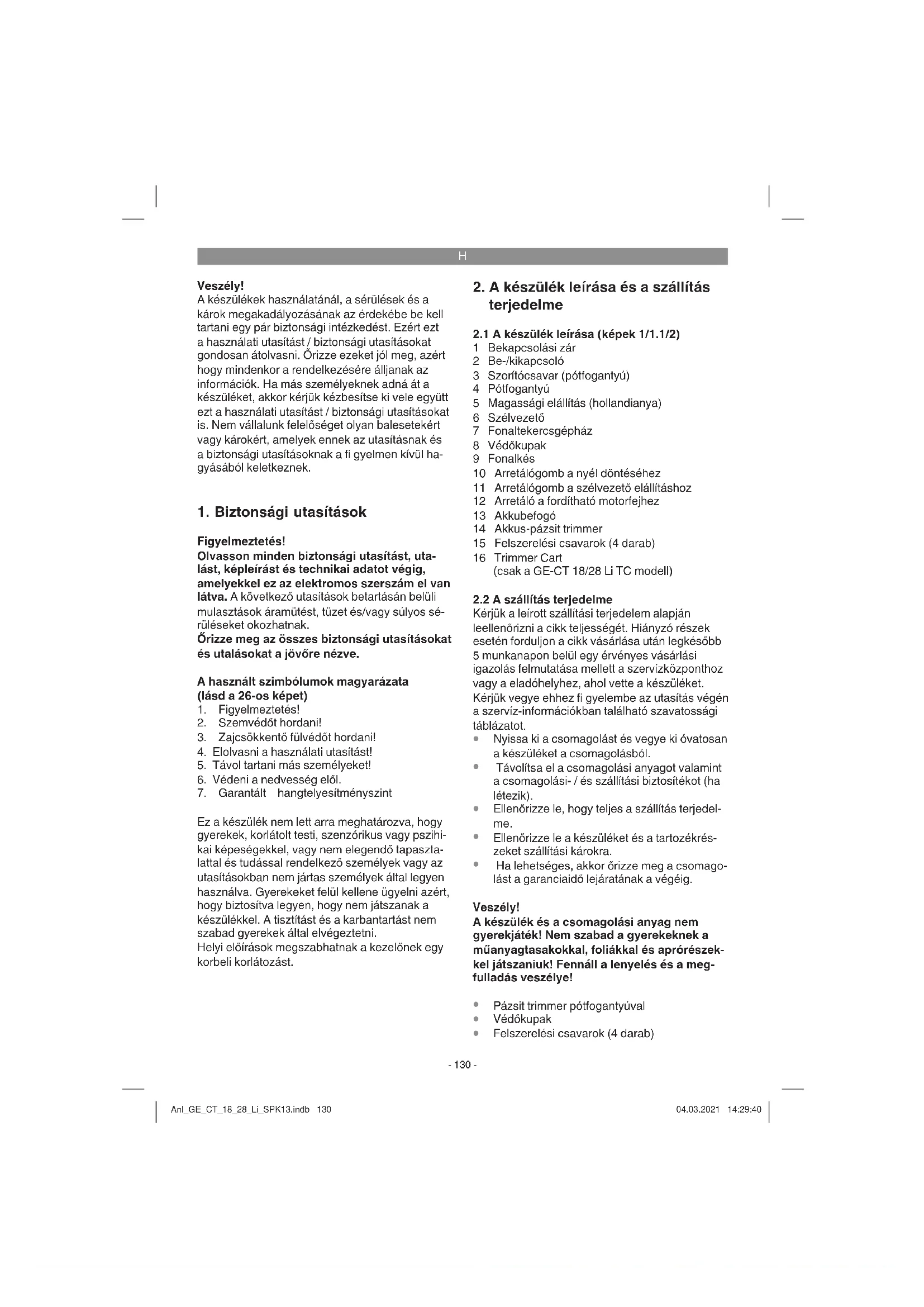 Ne használja a pázsit trimmert védőberendezés nélkül. Anl_GE_CT_18_28_Li_SPK13.indb 133Anl_GE_CT_18_28_Li_SPK13.indb 133 04.03.2021 14:29:4004.03.2021 14:29:40H