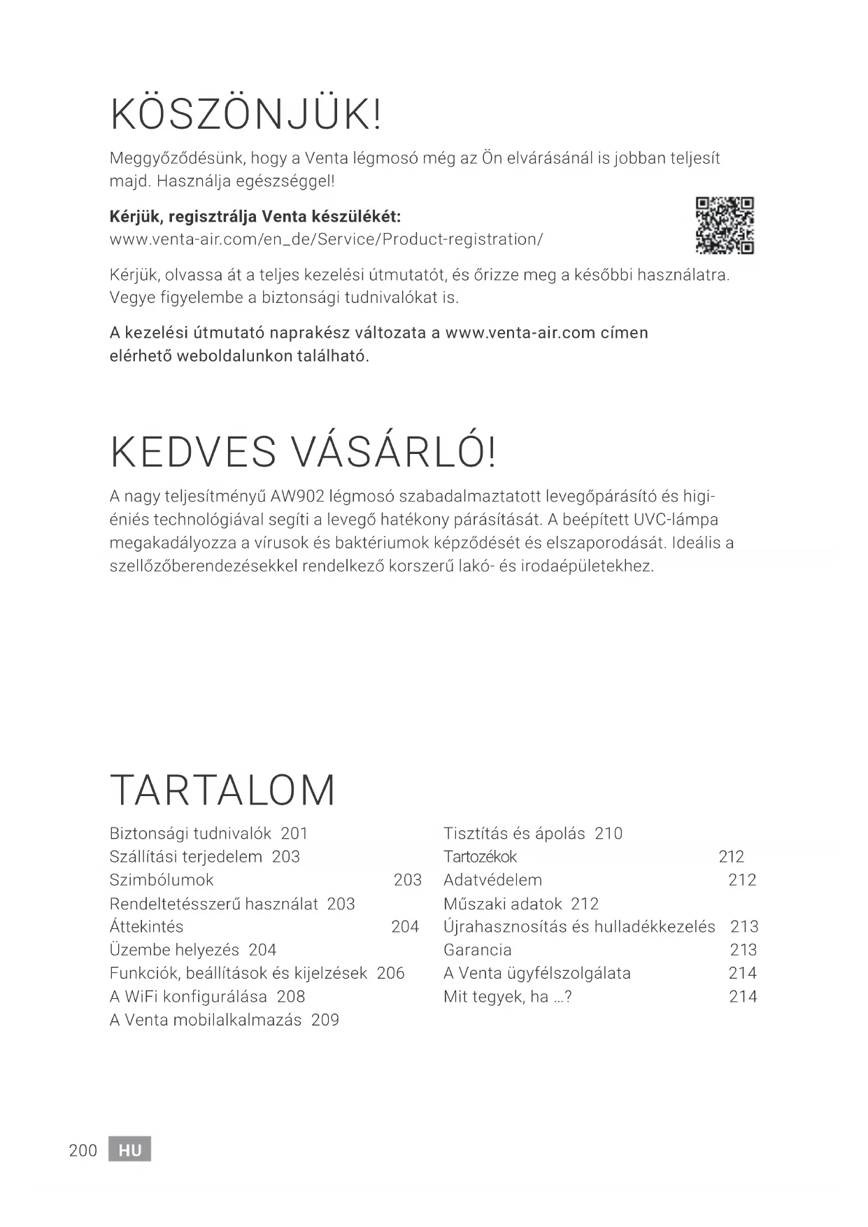 Prípadne aktualizujte operačný systém vášho smartfónu, resp. tabletu.200 DE200 HU Biztonsági tudnivalók 201 Szállítási terjedelem 203 Szimbólumok 203 Rendeltetésszerű használat 203 Áttekintés 204 Üzembe helyezés 204 Funkciók, beállítások és kijelzések 206 A WiFi konfigurálása 208 A Venta mobilalkalmazás 209 Tisztítás és ápolás 210 Tartozékok 212 Adatvédelem 212 Műszaki adatok 212 Újrahasznosítás és hulladékkezelés 213 Garancia 213 A Venta ügyfélszolgálata 214 Mit tegyek, ha …? 214 KÖSZÖNJÜK! Meggyőződésünk, hogy a Venta légmosó még az Ön elvárásánál is jobban teljesít majd. Használja egészséggel! Kérjük, regisztrálja Venta készülékét: www.venta-air.com/en_de/Service/Product-registration/ Kérjük, olvassa át a teljes kezelési útmutatót, és őrizze meg a későbbi használatra. Vegye figyelembe a biztonsági tudnivalókat is. A kezelési útmutató naprakész változata a www.venta-air.com címen elérhető weboldalunkon található. KEDVES VÁSÁRLÓ! A nagy teljesítményű AW902 légmosó szabadalmaztatott levegőpárásító és higi- éniés technológiával segíti a levegő hatékony párásítását. A beépített UVC-lámpa megakadályozza a vírusok és baktériumok képződését és elszaporodását. Ideális a szellőzőberendezésekkel rendelkező korszerű lakó- és irodaépületekhez.