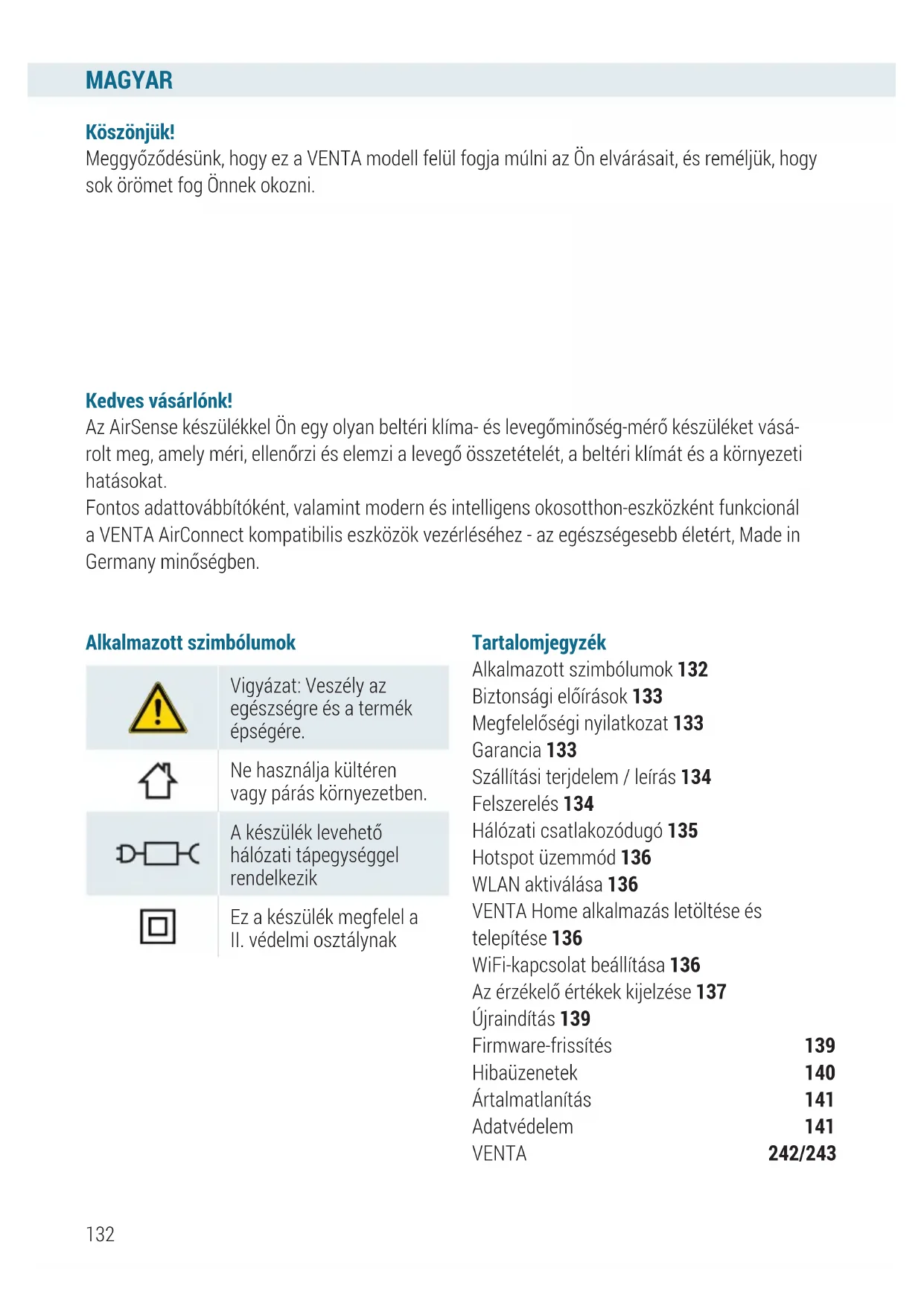 Tartalomjegyzék Alkalmazott szimbólumok 132 Biztonsági előírások 133 Megfelelőségi nyilatkozat 133 Garancia 133 Szállítási terjdelem / leírás 134 Felszerelés 134 Hálózati csatlakozódugó 135 Hotspot üzemmód 136 WLAN aktiválása 136 VENTA Home alkalmazás letöltése és telepítése 136 WiFi-kapcsolat beállítása 136 Az érzékelő értékek kijelzése 137 Újraindítás 139 Firmware-frissítés 139 Hibaüzenetek 140 Ártalmatlanítás 141 Adatvédelem 141 VENTA 242/243MAGYAR