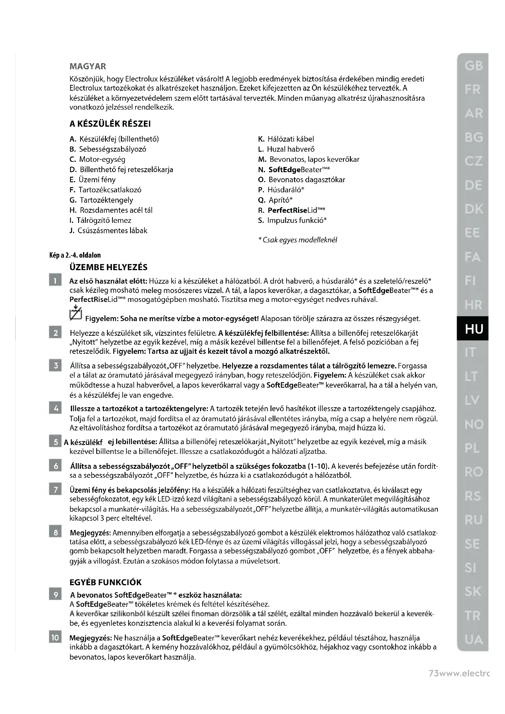 MAGYAR Köszönjük, hogy Electrolux készüléket vásárolt! A legjobb eredmények biztosítása érdekében mindig eredeti Electrolux tartozékokat és alkatrészeket használjon. Ezeket kifejezetten az Ön készülékéhez tervezték. A készüléket a környezetvédelem szem előtt tartásával tervezték. Minden műanyag alkatrész újrahasznosításra vonatkozó jelzéssel rendelkezik. A KÉSZÜLÉK RÉSZEI A. Készülékfej (billenthető) B. Sebességszabályozó C. Motor-egység D. Billenthető fej reteszelőkarja E. Üzemi fény F. Tartozékcsatlakozó G. Tartozéktengely H. Rozsdamentes acél tál