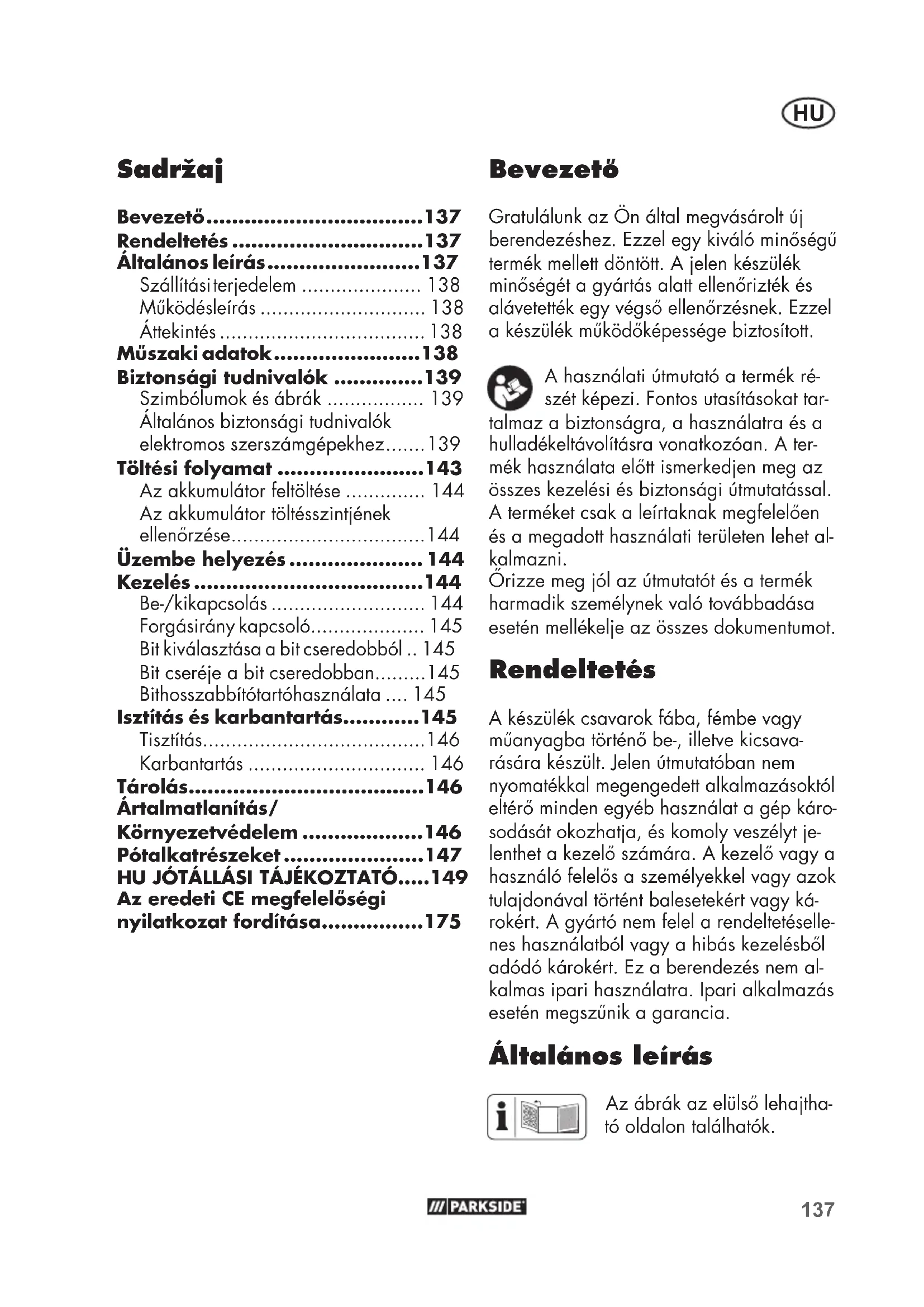 - Bevezető Gratulálunk az Ön által megvásárolt új berendezéshez. Ezzel egy kiváló minőségű termék mellett döntött. A jelen készülék minőségét a gyártás alatt ellenőrizték és alávetették egy végső ellenőrzésnek. Ezzel a készülék működőképessége biztosított. A használati útmutató a termék ré- szét képezi. Fontos utasításokat tar- talmaz a biztonságra, a használatra és a hulladékeltávolításra vonatkozóan. A ter- mék használata előtt ismerkedjen meg az összes kezelési és biztonsági útmutatással. A terméket csak a leírtaknak megfelelően és a megadott használati területen lehet al- kalmazni. Őrizze meg jól az útmutatót és a termék harmadik személynek való továbbadása esetén mellékelje az összes dokumentumot. Rendeltetés A készülék csavarok fába, fémbe vagy műanyagba történő be-, illetve kicsava- rására készült. Jelen útmutatóban nem nyomatékkal megengedett alkalmazásoktól eltérő minden egyéb használat a gép káro- sodását okozhatja, és komoly veszélyt je- lenthet a kezelő számára. A kezelő vagy a használó felelős a személyekkel vagy azok tulajdonával történt balesetekért vagy ká- rokért. A gyártó nem felel a rendeltetéselle- nes használatból vagy a hibás kezelésből adódó károkért. Ez a berendezés nem al- kalmas ipari használatra. Ipari alkalmazás esetén megszűnik a garancia. Általános leírás Az ábrák az elülső lehajtha- tó oldalon találhatók. Az eredeti CE megfelelőségi nyilatkozat fordítása p. 1751