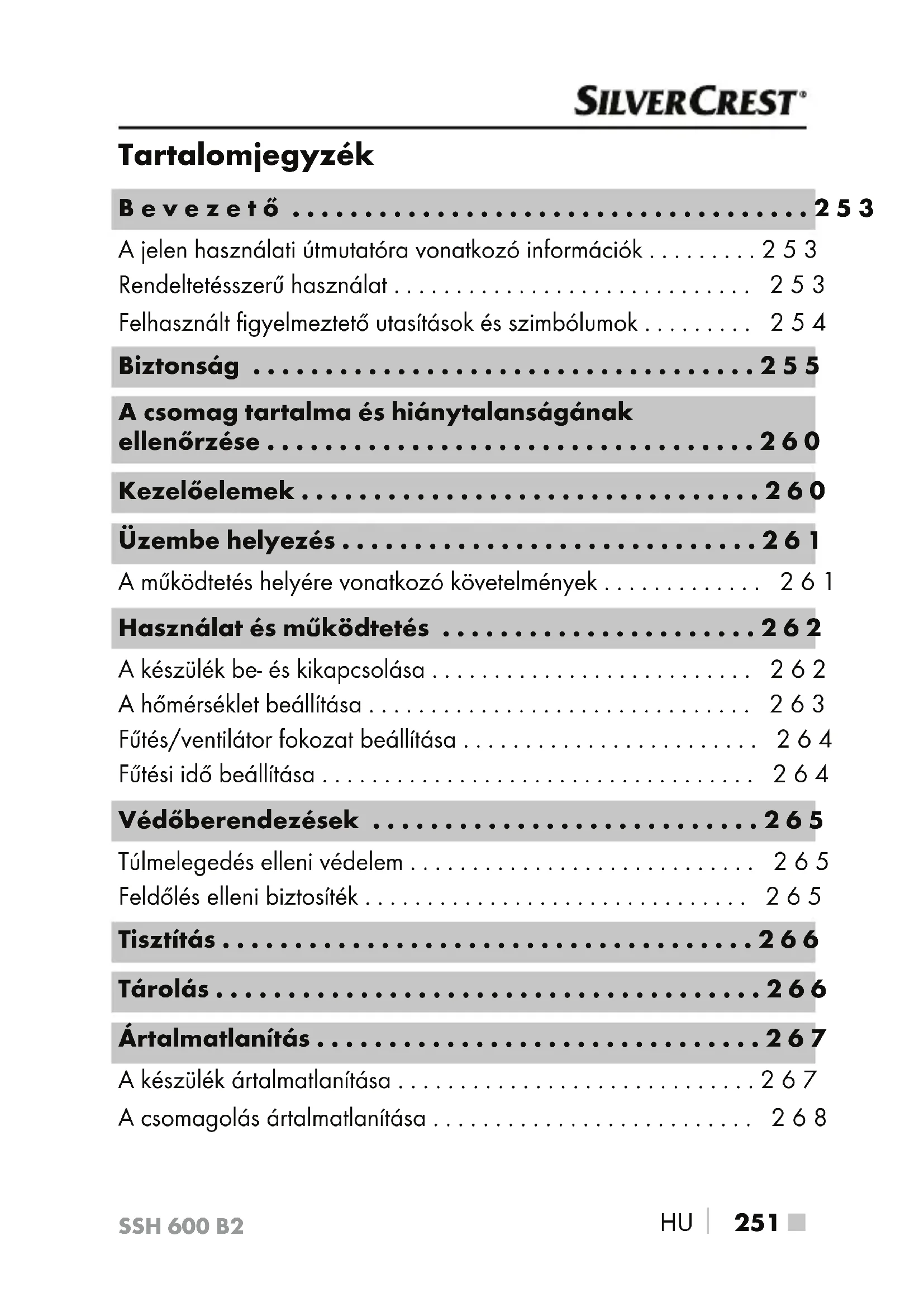 253 ■ Bevezető A jelen használati útmutatóra vonatkozó információk Gratulálunk új készüléke megvásárlásához. Vásárlásával kiváló minőségű termék mellett döntött. A használati út- mutató a termék része. Fontos tudnivalókat tartalmaz a biztonságra, használatra és ártalmatlanításra vonatkozóan. A termék használata előtt ismerkedjen meg valamennyi használati és biztonsági utasítással. A terméket csak a leírtak szerint és a megadott célokra használja. A termék harmadik személynek történő továbbadása esetén adja át a készülékhez tartozó valamennyi leírást is. Rendeltetésszerű használat Ez a kerámia csatlakozódugós fűtőventilátor, a továbbiakban készü- lék vagy fűtőventilátor, csak zárt belső helyiségek fűtésére készült, és csak magáncélú használatra szolgál. A készülék nem alkalmas olyan helyiségekben történő használatra, ahol különleges feltételek állnak fenn, mint például korrozív vagy robbanásveszélyes légkör (por, gőz vagy gáz). Nem használható pl. autók vagy sátrak fűtésére. A készüléket nem szabad zárt helyiségen kívül használni. A készülék minden más használata vagy módosítása nem rendeltetésszerűnek minősül és jelentős balesetveszélyt okozhat. Nem kereskedelmi vagy ipari területen történő használatra készült.SSH 600 B2 ■ 254