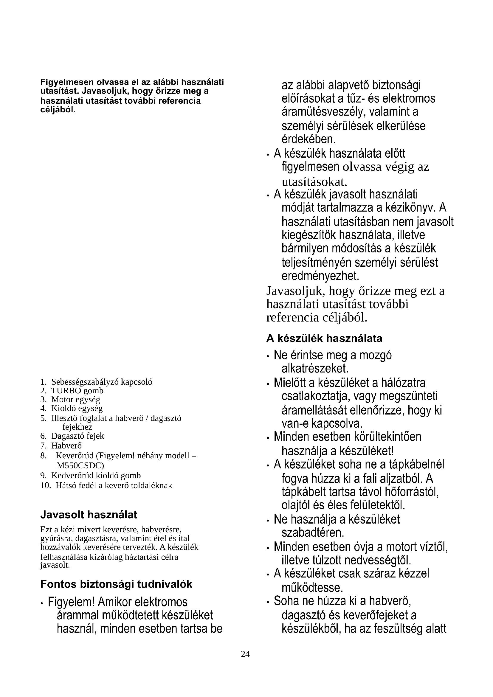 Javasolt használat Ezt a kézi mixert keverésre, habverésre, gyúrásra, dagasztásra, valamint étel és ital hozzávalók keverésére tervezték. A készülék felhasználása kizárólag háztartási célra javasolt. Fontos biztonsági tudnivalók