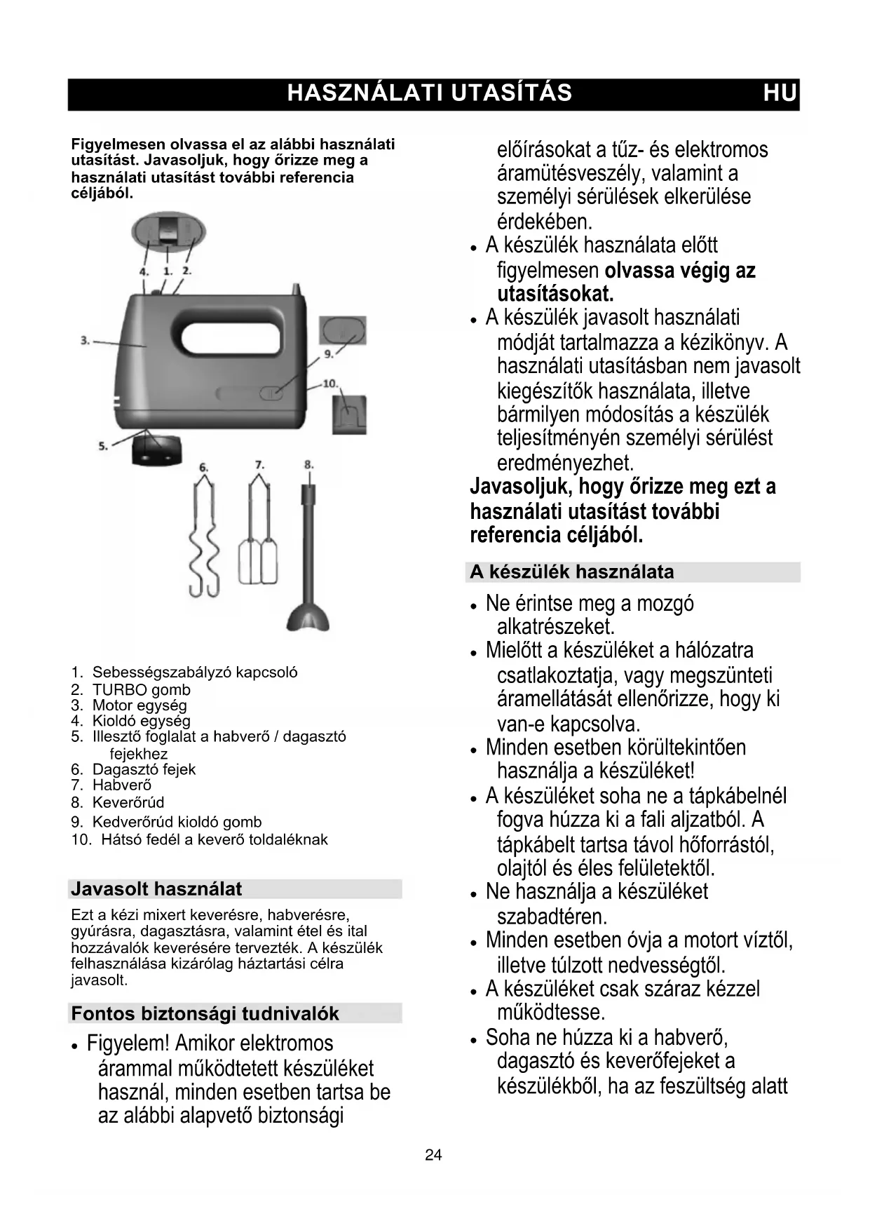 Javasolt használat Ezt a kézi mixert keverésre, habverésre, gyúrásra, dagasztásra, valamint étel és ital hozzávalók keverésére tervezték. A készülék felhasználása kizárólag háztartási célra javasolt. Fontos biztonsági tudnivalók