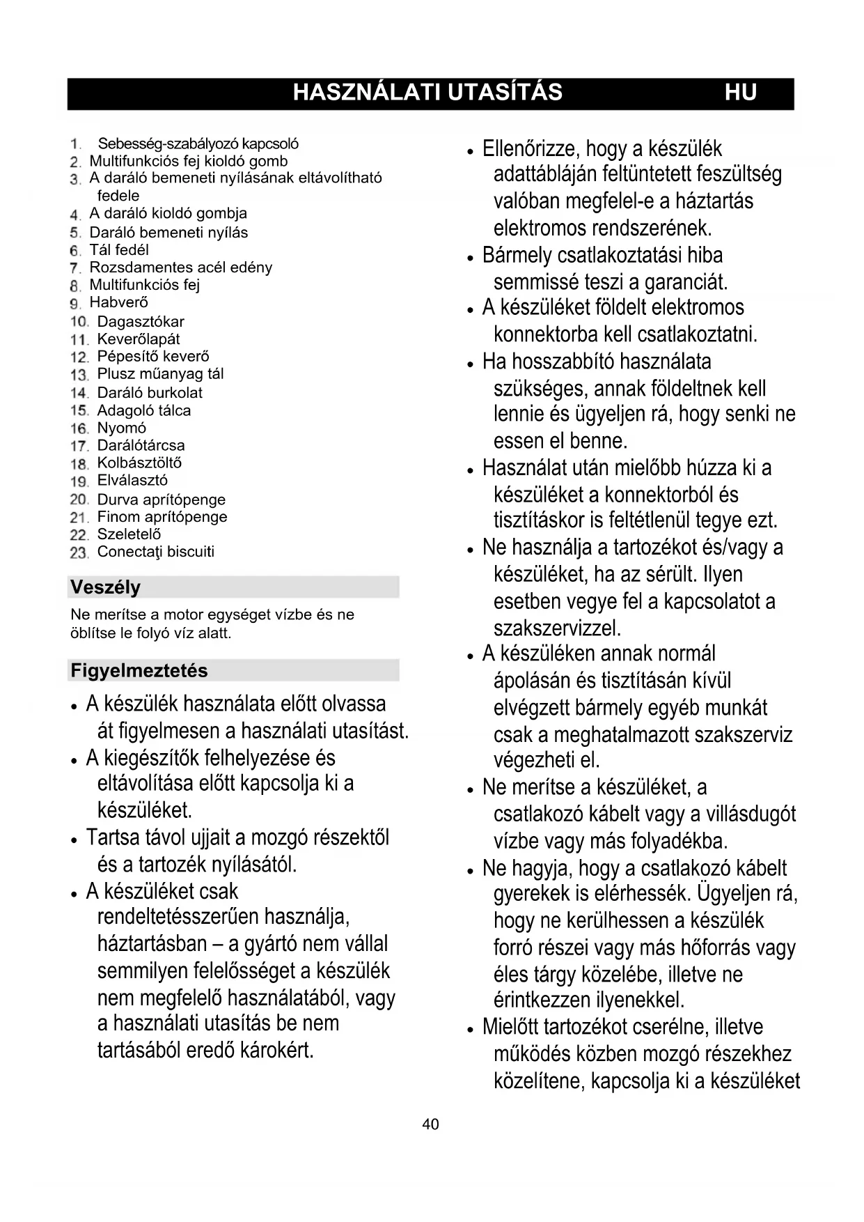 Sebesség-szabályozó kapcsoló Multifunkciós fej kioldó gomb A daráló bemeneti nyílásának eltávolítható fedele A daráló kioldó gombja Daráló bemeneti nyílás Tál fedél Rozsdamentes acél edény Multifunkciós fej Habverő Dagasztókar Keverőlapát Pépesítő keverő Plusz műanyag tál Daráló burkolat Adagoló tálca Nyomó Darálótárcsa Kolbásztöltő Elválasztó Durva aprítópenge Finom aprítópenge Szeletelő Conectaţi biscuiti Veszély Ne merítse a motor egységet vízbe és ne öblítse le folyó víz alatt. Figyelmeztetés