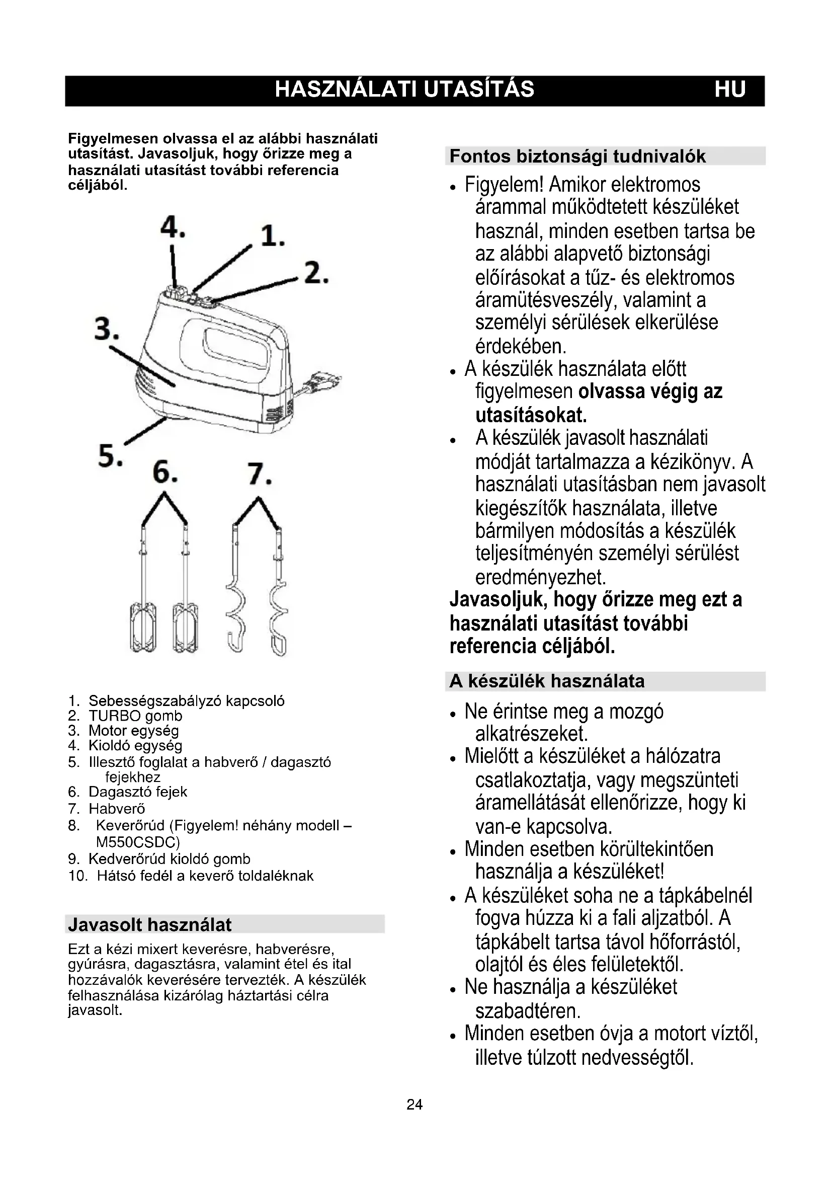 Javasolt használat Ezt a kézi mixert keverésre, habverésre, gyúrásra, dagasztásra, valamint étel és ital hozzávalók keverésére tervezték. A készülék felhasználása kizárólag háztartási célra javasolt. Fontos biztonsági tudnivalók