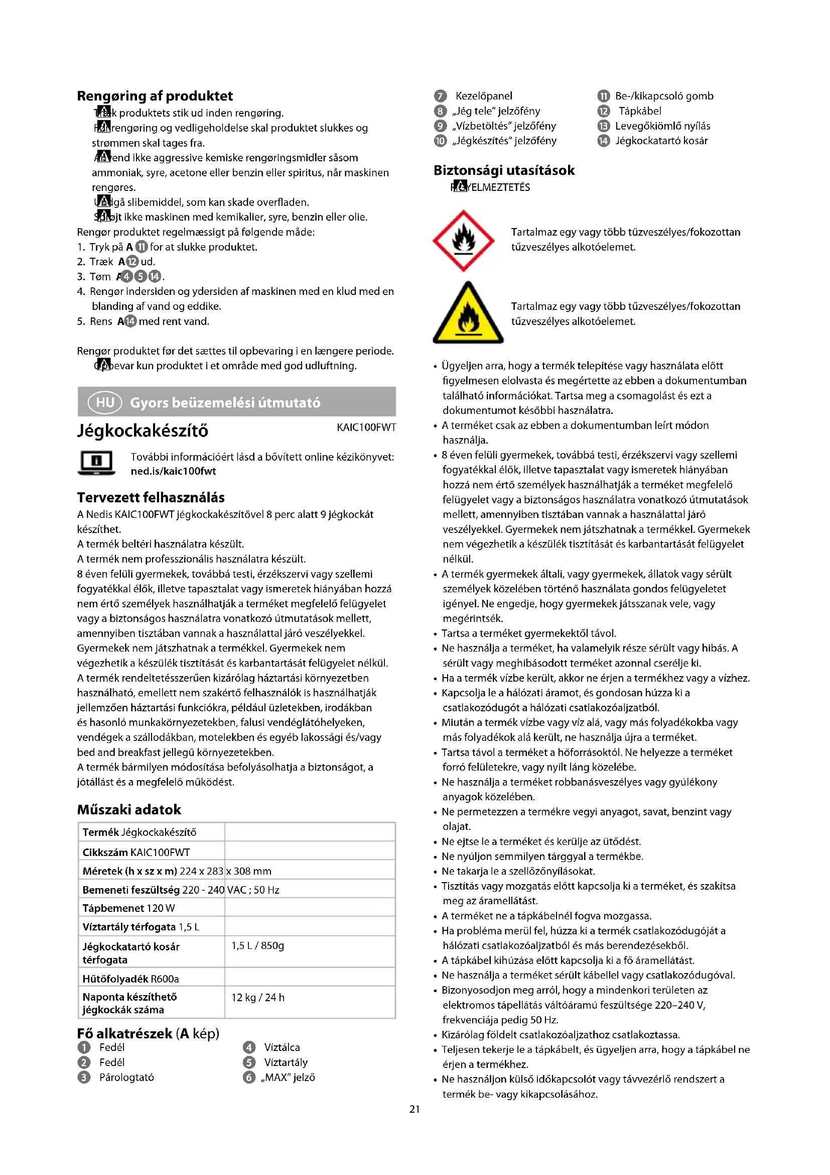 Gyors beüzemelési útmutató Jégkockakészítő KAIC100FWTTovábbi információért lásd a bővített online kézikönyvet: ned.is/kaic100fwt Tervezett felhasználás A Nedis KAIC100FWT jégkockakészítővel 8 perc alatt 9 jégkockát készíthet.A termék beltéri használatra készült.A termék nem professzionális használatra készült.8 éven felüli gyermekek, továbbá testi, érzékszervi vagy szellemi fogyatékkal élők, illetve tapasztalat vagy ismeretek hiányában hozzá nem értő személyek használhatják a terméket megfelelő felügyelet vagy a biztonságos használatra vonatkozó útmutatások mellett, amennyiben tisztában vannak a használattal járó veszélyekkel. Gyermekek nem játszhatnak a termékkel. Gyermekek nem végezhetik a készülék tisztítását és karbantartását felügyelet nélkül.A termék rendeltetésszerűen kizárólag háztartási környezetben használható, emellett nem szakértő felhasználók is használhatják jellemzően háztartási funkciókra, például üzletekben, irodákban és hasonló munkakörnyezetekben, falusi vendéglátóhelyeken, vendégek a szállodákban, motelekben és egyéb lakossági és/vagy bed and breakfast jellegű környezetekben.A termék bármilyen módosítása befolyásolhatja a biztonságot, a jótállást és a megfelelő működést. Műszaki adatok Termék JégkockakészítőCikkszám KAIC100FWTMéretek (h x sz x m) 224 x 283 x 308 mmBemeneti feszültség 220 - 240 VAC ; 50 HzTápbemenet 120 WVíztartály térfogata 1,5 LJégkockatartó kosár térfogata1,5 L / 850gHűtőfolyadék R600aNaponta készíthető jégkockák száma12 kg / 24 h Fő alkatrészek (A kép) 1 Fedél 2 Fedél 3 Párologtató 4 Víztálca 5 Víztartály 6 „MAX” jelző22 Amikor az A megtelt. A „Jég tele” jelzőfény A villog.7. Azonnal vegye ki a jeget, ne hagyja túlfolyni A