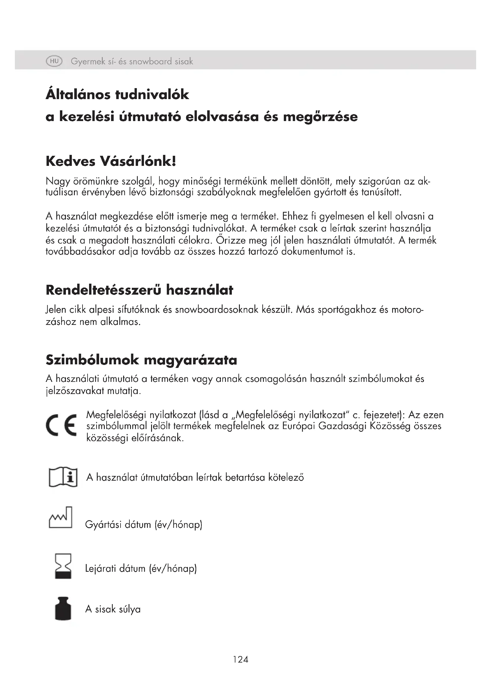 Általános tudnivalók a kezelési útmutató elolvasása és megőrzése Kedves Vásárlónk! Nagy örömünkre szolgál, hogy minőségi termékünk mellett döntött, mely szigorúan az ak- tuálisan érvényben lévő biztonsági szabályoknak megfelelően gyártott és tanúsított. A használat megkezdése előtt ismerje meg a terméket. Ehhez gyelmesen el kell olvasni a kezelési útmutatót és a biztonsági tudnivalókat. A terméket csak a leírtak szerint használja és csak a megadott használati célokra. Őrizze meg jól jelen használati útmutatót. A termék továbbadásakor adja tovább az összes hozzá tartozó dokumentumot is. Rendeltetésszerű használat Jelen cikk alpesi sífutóknak és snowboardosoknak készült. Más sportágakhoz és motoro- záshoz nem alkalmas. Szimbólumok magyarázata A használati útmutató a terméken vagy annak csomagolásán használt szimbólumokat és jelzőszavakat mutatja. Megfelelőségi nyilatkozat (lásd a „Megfelelőségi nyilatkozat“ c. fejezetet): Az ezen szimbólummal jelölt termékek megfelelnek az Európai Gazdasági Közösség összes közösségi előírásának. A használat útmutatóban leírtak betartása kötelező Gyártási dátum (év/hónap) Lejárati dátum (év/hónap) A sisak súlyaGyermek sí- és snowboard sisak