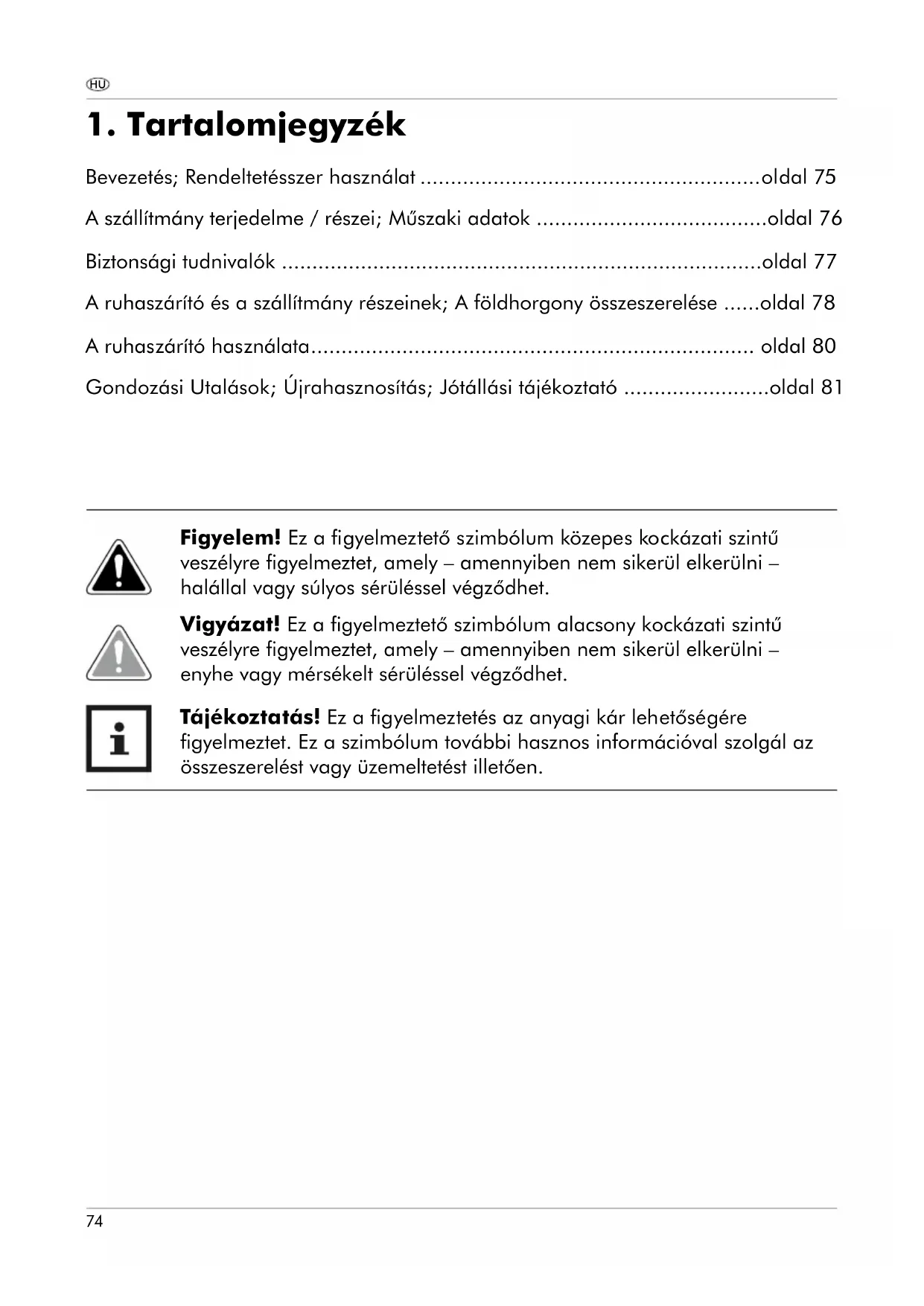 Bevezetés; Rendeltetésszer használat ........................................................oldal 75 A szállítmány terjedelme / részei; Műszaki adatok ......................................oldal 76 Biztonsági tudnivalók ...............................................................................oldal 77 A ruhaszárító és a szállítmány részeinek; A földhorgony összeszerelése ......oldal 78 A ruhaszárító használata ......................................................................... oldal 80 Gondozási Utalások; Újrahasznosítás; Jótállási tájékoztató ........................oldal 81 Figyelem! Ez a figyelmeztető szimbólum közepes kockázati szintű veszélyre figyelmeztet, amely – amennyiben nem sikerül elkerülni – halállal vagy súlyos sérüléssel végződhet. Vigyázat! Ez a figyelmeztető szimbólum alacsony kockázati szintű veszélyre figyelmeztet, amely – amennyiben nem sikerül elkerülni – enyhe vagy mérsékelt sérüléssel végződhet. Tájékoztatás! Ez a figyelmeztetés az anyagi kár lehetőségére figyelmeztet. Ez a szimbólum további hasznos információval szolgál az összeszerelést vagy üzemeltetést illetően. HU75