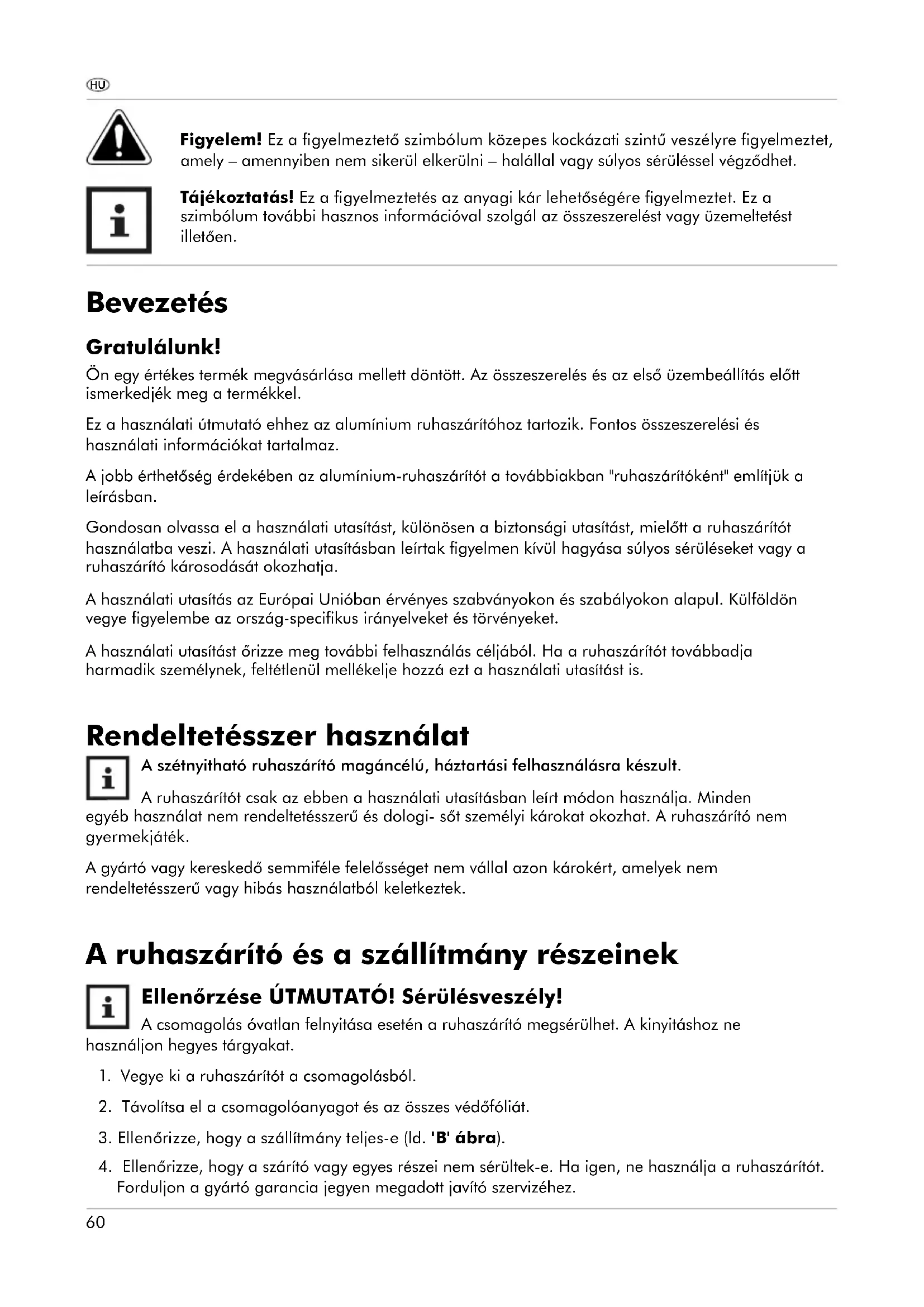 A szétnyitható ruhaszárító magáncélú, háztartási felhasználásra készult. A ruhaszárítót csak az ebben a használati utasításban leírt módon használja. Minden egyéb használat nem rendeltetésszerű és dologi- sőt személyi károkat okozhat. A ruhaszárító nem gyermekjáték. A gyártó vagy kereskedő semmiféle felelősséget nem vállal azon károkért, amelyek nem rendeltetésszerű vagy hibás használatból keletkeztek. A ruhaszárító és a szállítmány részeinek