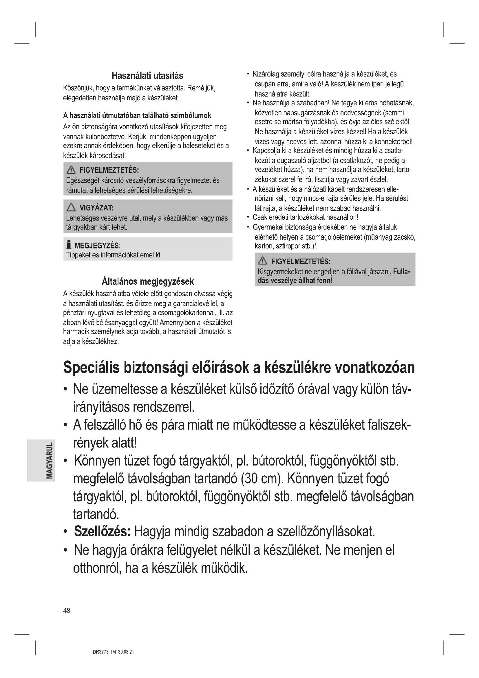 - Gyermekei biztonsága érdekében ne hagyja általuk elérhető helyen a csomagolóelemeket (műanyag zacskó, karton, sztiropor stb.)! FIGYELMEZTETÉS: Kisgyermekeket ne engedjen a fóliával játszani. Fulla- dás veszélye állhat fenn! Speciális biztonsági előírások a készülékre vonatkozóan