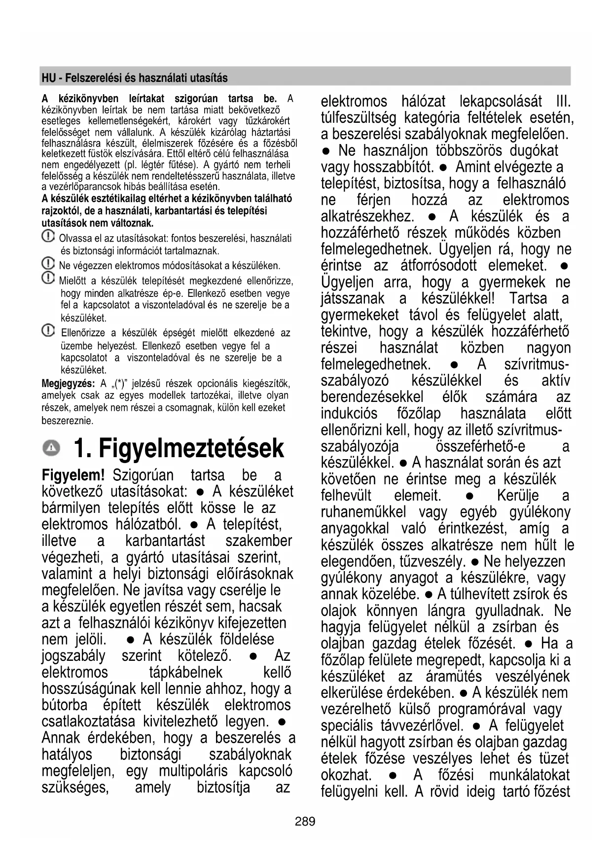 Figyelem! Szigorúan tartsa be a következő utasításokat: ● A készüléket bármilyen telepítés előtt kösse le az elektromos hálózatból. ● A telepítést, illetve a karbantartást szakember végezheti, a gyártó utasításai szerint, valamint a helyi biztonsági előírásoknak megfelelően. Ne javítsa vagy cserélje le a készülék egyetlen részét sem, hacsak azt a felhasználói kézikönyv kifejezetten nem jelöli. ● A készülék földelése jogszabály szerint kötelező. ● Az elektromos tápkábelnek kellő hosszúságúnak kell lennie ahhoz, hogy a bútorba épített készülék elektromos csatlakoztatása kivitelezhető legyen. ● Annak érdekében, hogy a beszerelés a hatályos biztonsági szabályoknak megfeleljen, egy multipoláris kapcsoló szükséges, amely biztosítja az elektromos hálózat lekapcsolását III. túlfeszültség kategória feltételek esetén, a beszerelési szabályoknak megfelelően. ● Ne használjon többszörös dugókat vagy hosszabbítót. ● Amint elvégezte a telepítést, biztosítsa, hogy a felhasználó ne férjen hozzá az elektromos alkatrészekhez. ● A készülék és a hozzáférhető részek működés közben felmelegedhetnek. Ügyeljen rá, hogy ne érintse az átforrósodott elemeket. ● Ügyeljen arra, hogy a gyermekek ne játsszanak a készülékkel! Tartsa a gyermekeket távol és felügyelet alatt, tekintve, hogy a készülék hozzáférhető részei használat közben nagyon felmelegedhetnek. ● A szívritmus- szabályozó készülékkel és aktív berendezésekkel élők számára az indukciós főzőlap használata előtt ellenőrizni kell, hogy az illető szívritmus- szabályozója összeférhető-e a készülékkel. ● A használat során és azt követően ne érintse meg a készülék felhevült elemeit. ● Kerülje a ruhaneműkkel vagy egyéb gyúlékony anyagokkal való érintkezést, amíg a készülék összes alkatrésze nem hűlt le elegendően, tűzveszély. ● Ne helyezzen gyúlékony anyagot a készülékre, vagy annak közelébe. ● A túlhevített zsírok és olajok könnyen lángra gyulladnak. Ne hagyja felügyelet nélkül a zsírban és olajban gazdag ételek főzését. ● Ha a főzőlap felülete megrepedt, kapcsolja ki a készüléket az áramütés veszélyének elkerülése érdekében. ● A készülék nem vezérelhető külső programórával vagy speciális távvezérlővel. ● A felügyelet nélkül hagyott zsírban és olajban gazdag ételek főzése veszélyes lehet és tüzet okozhat. ● A főzési munkálatokat felügyelni kell. A rövid ideig tartó főzést290 folyamatosan felügyelni kell. ● SOHA ne próbálja vízzel eloltani a lángokat. Ellenkezőleg, kapcsolja ki a készüléket és fojtsa el a lángokat, például egy fedővel vagy egy tűzálló pokróccal. Tűzveszély: ne rakodjon a főzőlap felületére. ● Ne használjon gőztisztító gépeket, áramütés veszélye. ● Ne tegyen fém tárgyakat, mint például késeket, villákat, kanalakat és fedőket a főzőlapra, mert azok felforrósodhatnak. ● Mielőtt az elektromos hálózatra kötné a készüléket, ellenőrizze (a készülék alján található) adattáblát, hogy meggyőződjön róla, hogy az azon feltüntetett feszültség és teljesítmény megfelel-e a hálózati és csatlakozóaljzat feszültségének. Amennyiben kétségei lennének, forduljon villanyszerelőhöz. Fontos: ● Használat után a vezérlőszenzorral kapcsolja ki a főzőlapot és ne a lábas érzékelőre hagyatkozzon. ● Kerülje a folyadékok kiömlését. Főzésnél, illetve forralásnál csökkentse a hőfokot. ● Ne hagyja üresen, illetve ne tegyen üres serpenyőt vagy lábast a bekapcsolt melegítő részekre. ● Ha befejezte a főzést, kapcsolja le a vonatkozó főzési területet. ● A főzéshez soha ne használjon alumínium fóliát, és soha ne helyezzen közvetlenül a felületre alumínium fóliába csomagolt termékeket. Az alumínium megolvad és javíthatatlanul tönkreteszi a készüléket. ● Soha ne melegítsen élelmiszert tartalmazó lezárt dobozt vagy konzervet anélkül, hogy felnyitná: felrobbanhat! Ez a figyelmeztetés a többi, más típusú főzőlapra is vonatkozik. ● Az olyan nagy teljesítményű funkciók, mint a booster, nem használható bármilyen típusú folyadék melegítéséhez, mint amilyen például a sütőolaj. A túl magas hőmérséklet veszélyes lehet. Ilyen esetben használjon alacsonyabb teljesítményfokozatot. ● A főzőedényeket közvetlenül a főzőlapra kell helyezni, középre igazítva. Semmilyen esetben se tegyen semmilyen tárgyat a főzőlap és a főzőedény közé. ● Magas hőmérséklet esetén a készülék automatikusan csökkenti a főzőzóna teljesítményfokozatát. ● Bármiféle tisztítási vagy karbantartási művelet előtt válassza le a készüléket az elektromos hálózatról, kihúzva a vezetéket vagy lekapcsolva a lakás főkapcsolóját. ● Minden telepítési vagy karbantartási folyamathoz viseljen munkavédelmi kesztyűt. ● A készüléket 8 évnél nem fiatalabb gyermekek és csökkent fizikai, érzékszervi vagy mentális képességekkel rendelkező, vagy tapasztalatlan, vagy a szükséges ismeretekkel nem rendelkező személyek csak akkor használhatják, ha felügyelet alatt vannak vagy ha megkapták a készülék biztonságos használatával és a benne rejlő veszélyek megértésével kapcsolatos utasításokat. ● Ellenőrizze, hogy a gyerekek ne játszanak a készülékkel. ● A tisztítási és karbantartási műveleteket gyermekek csak felügyelet mellett végezhetik. ● A helyiségben megfelelő szellőztetés legyen, amikor a készüléket más gáz● vagy tüzelőberendezéssel egyidejűleg használja. ● A készüléket gyakran tisztítsa mind belül, mind kívül (LEGALÁBB HAVI EGYSZER), mindenképp tartsa be a karbantartási utasításokban leírtakat. ● A készülék tiszt