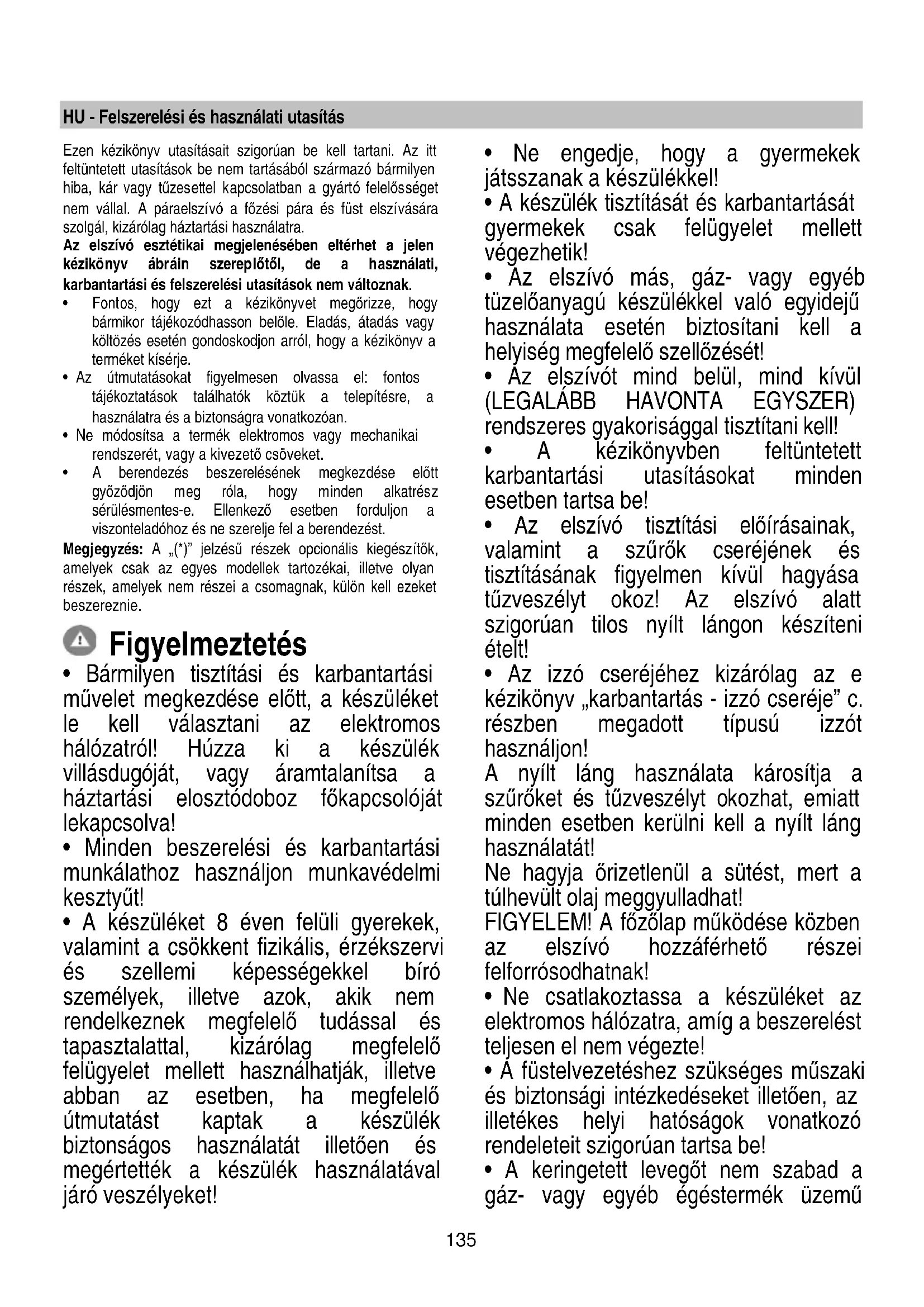 - Az izzó cseréjéhez kizárólag az e kézikönyv „karbantartás - izzó cseréje” c. részben megadott típusú izzót használjon! A nyílt láng használata károsítja a szűrőket és tűzveszélyt okozhat, emiatt minden esetben kerülni kell a nyílt láng használatát! Ne hagyja őrizetlenül a sütést, mert a túlhevült olaj meggyulladhat! FIGYELEM! A főzőlap működése közben az elszívó hozzáférhető részei felforrósodhatnak!