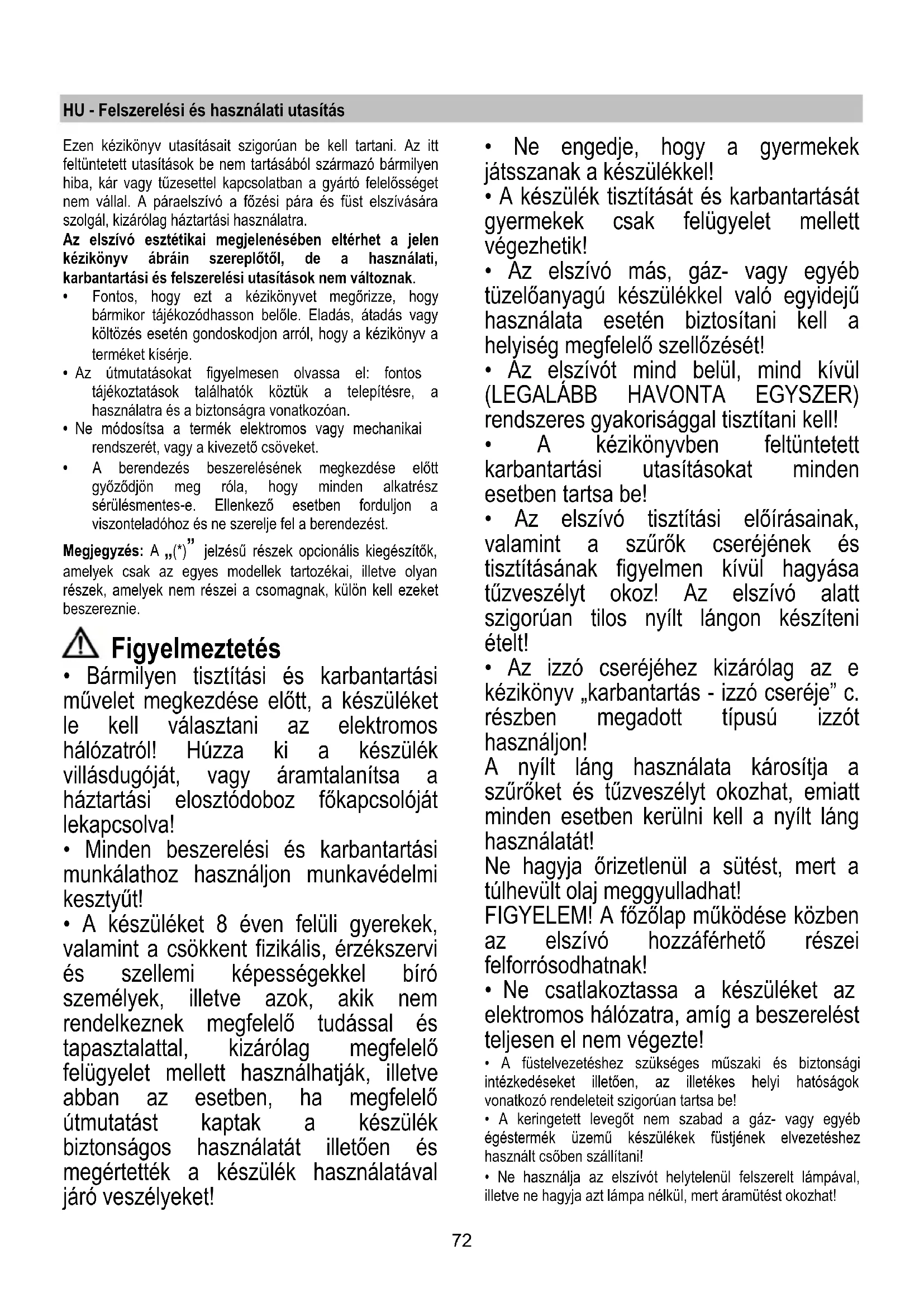 - Az izzó cseréjéhez kizárólag az e kézikönyv „karbantartás - izzó cseréje” c. részben megadott típusú izzót használjon! A nyílt láng használata károsítja a szűrőket és tűzveszélyt okozhat, emiatt minden esetben kerülni kell a nyílt láng használatát! Ne hagyja őrizetlenül a sütést, mert a túlhevült olaj meggyulladhat! FIGYELEM! A főzőlap működése közben az elszívó hozzáférhető részei felforrósodhatnak!