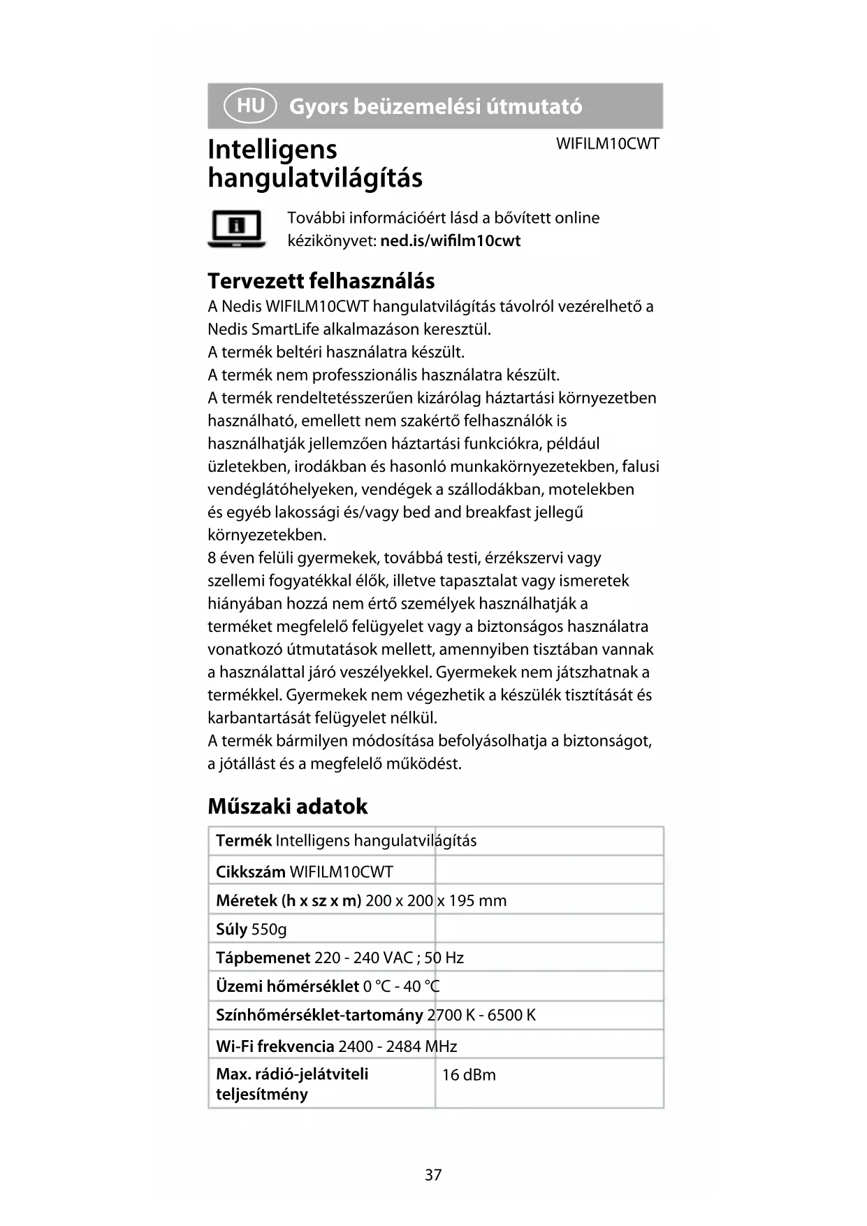 Gyors beüzemelési útmutató Intelligens hangulatvilágítás WIFILM10CWT További információért lásd a bővített online kézikönyvet: ned.is/wilm10cwt Tervezett felhasználás A Nedis WIFILM10CWT hangulatvilágítás távolról vezérelhető a Nedis SmartLife alkalmazáson keresztül. A termék beltéri használatra készült. A termék nem professzionális használatra készült. A termék rendeltetésszerűen kizárólag háztartási környezetben használható, emellett nem szakértő felhasználók is használhatják jellemzően háztartási funkciókra, például üzletekben, irodákban és hasonló munkakörnyezetekben, falusi vendéglátóhelyeken, vendégek a szállodákban, motelekben és egyéb lakossági és/vagy bed and breakfast jellegű környezetekben. 8 éven felüli gyermekek, továbbá testi, érzékszervi vagy szellemi fogyatékkal élők, illetve tapasztalat vagy ismeretek hiányában hozzá nem értő személyek használhatják a terméket megfelelő felügyelet vagy a biztonságos használatra vonatkozó útmutatások mellett, amennyiben tisztában vannak a használattal járó veszélyekkel. Gyermekek nem játszhatnak a termékkel. Gyermekek nem végezhetik a készülék tisztítását és karbantartását felügyelet nélkül. A termék bármilyen módosítása befolyásolhatja a biztonságot, a jótállást és a megfelelő működést. Műszaki adatok Termék Intelligens hangulatvilágítás Cikkszám WIFILM10CWT Méretek (h x sz x m) 200 x 200 x 195 mm Súly 550g Tápbemenet 220 - 240 VAC ; 50 Hz Üzemi hőmérséklet 0 °C - 40 °C Színhőmérséklet-tartomány 2700 K - 6500 K Wi-Fi frekvencia 2400 - 2484 MHz Max. rádió-jelátviteli teljesítmény 16 dBm38 Fő alkatrészek (A kép) 1 Lámpa 2 Micro USB-csatlakozó 3 Hálózati adapter 4 USB tápkábel 5 Be- és kikapcsológomb Biztonsági utasítások