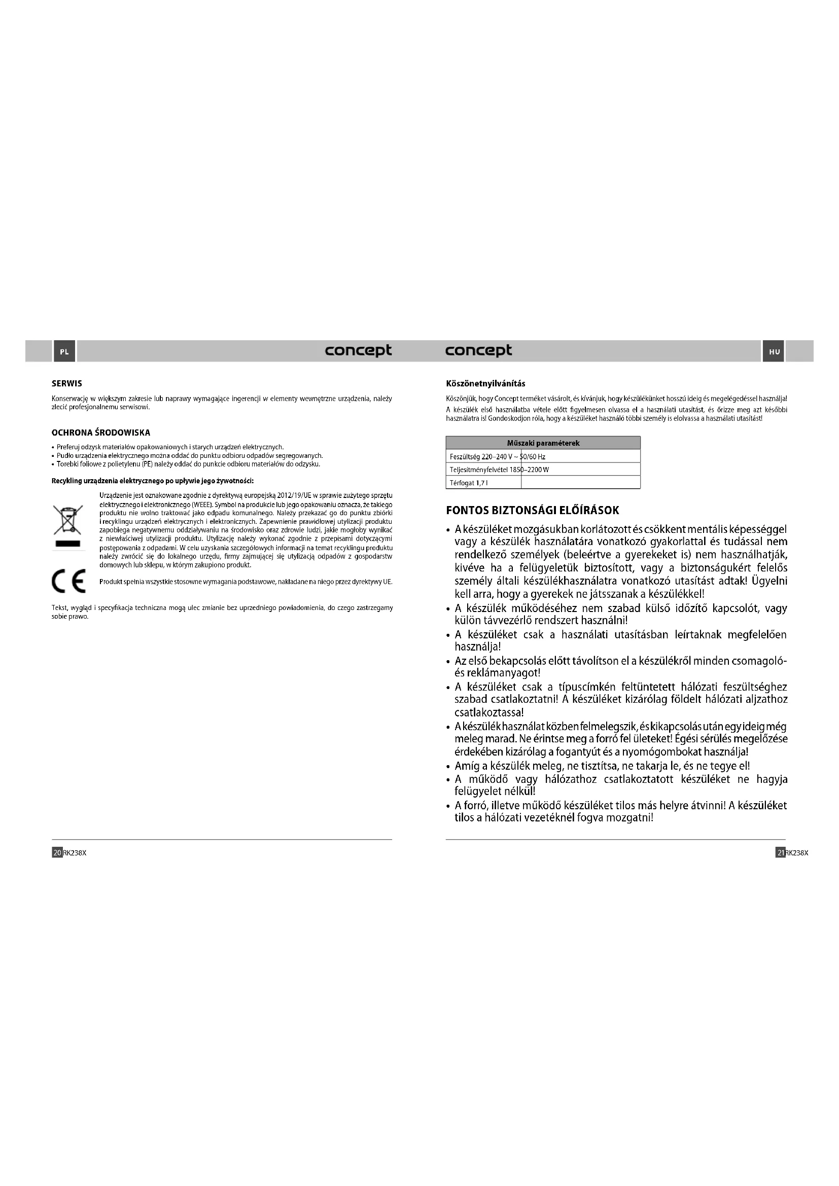 - A műanyag zacskókat (PE) tegye a műanyagok hulladékgyűjtő konténerébe! Használt elektromos és elektronikus berendezések megsemmisítése Ez a készülék az európai Elektromos hulladékról és elektromos berendezésekről (WEEE) szóló 2012/19/ EU irányelvnek megfelelően van megjelölve. A terméken vagy a csomagolásán található szimbólum jelzi, hogy a termék nem tartozik a vegyes háztartási hulladék közé. El kell vinni olyan helyre, ahol az elektromos és elektronikus hulladékot gyűjtik újrahasznosítás céljából. A termék megfelelő módon történő megsemmisítésének biztosításával megakadályozza a környezetet és az emberi egészséget veszélyeztető negatív hatásokat, amelyeket a nem megfelelő hulladék-megsemmisítés okozhatna. A megsemmisítést a hulladékgazdálkodási előírásoknak megfelelően kell végrehajtani. A termék újrahasznosítására vonatkozó részletesebb információkért forduljon az illetékes helyi hivatalhoz, aháztartási hulladék megsemmisítésével foglalkozó szolgáltatóhoz, vagy az üzlethez, ahol aterméket vásárolta. Ez a termék teljesíti minden rá vonatkozó EU-irányelv alapkövetelményeit. A szövegben, a kivitelben és a műszaki jellemzőkben előzetes figyelmeztetés nélkül sor kerülhet változtatásokra, minden módosításra vonatkozó jog fenntartva. Pateicība Pateicamies par šīs Concept ierīces iegādi. Ceram, ka būsiet apmierināti ar šo izstrādājumu visu tā kalpošanas laiku. Uzglabājiet rokasgrāmatu drošā vietā, lai nepieciešamības gadījumā varētu to pārlasīt. Nodrošiniet, lai arī citi cilvēki, kas izmanto šo ierīci, pirms šīs ierīces lietošanas būtu iepazinušies ar norādījumiem. Tehniskie raksturlielumi Spriegums 220–240 V ~ 50/60 Hz Jauda 1850–2200 W Tilpums 1,7 l SVARĪGI DROŠĪBAS NORĀDĪJUMI