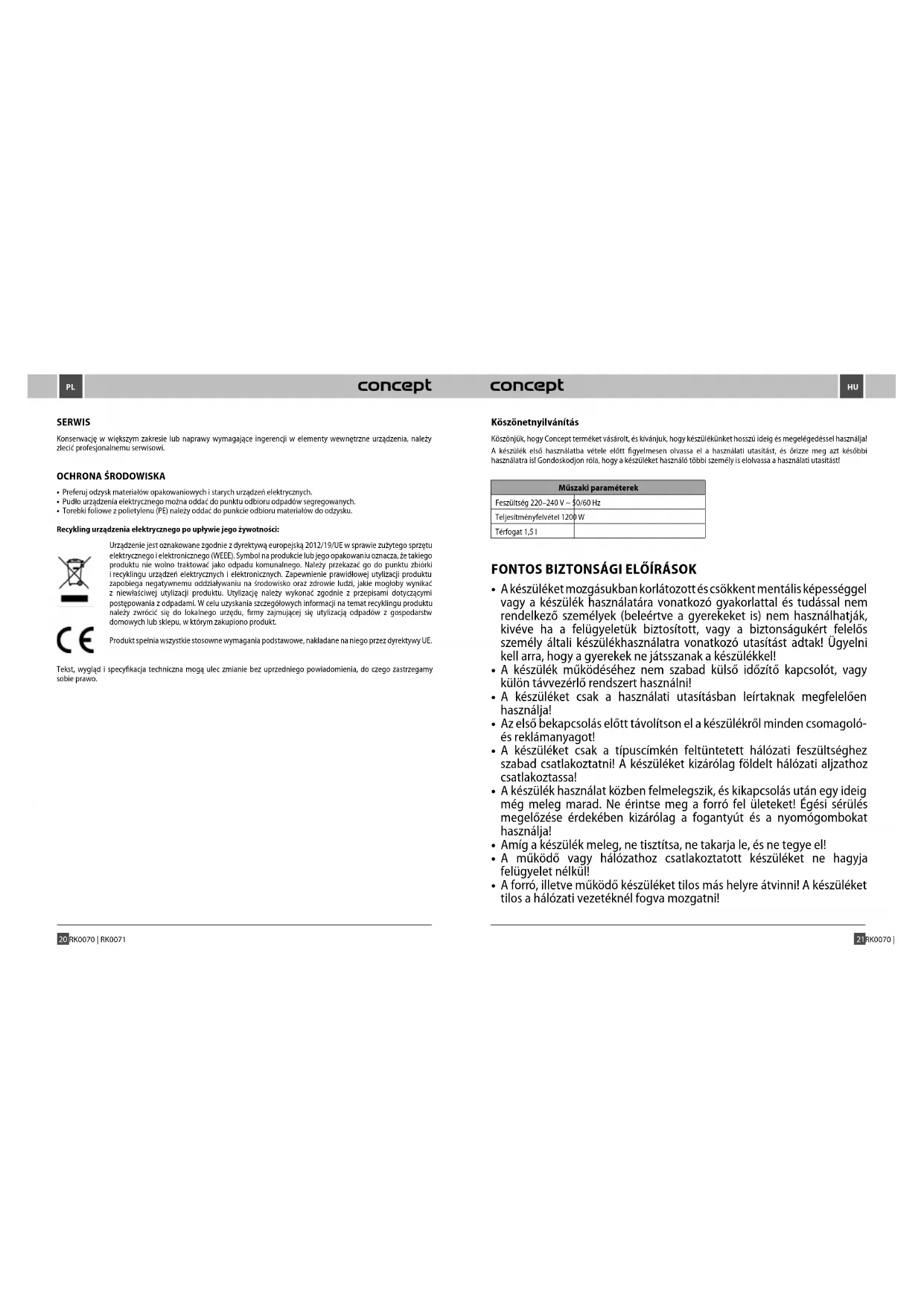 - A műanyag zacskókat (PE) tegye a műanyagok hulladékgyűjtő konténerébe! Használt elektromos és elektronikus berendezések megsemmisítése Ez a készülék az európai Elektromos hulladékról és elektromos berendezésekről (WEEE) szóló 2012/19/ EU irányelvnek megfelelően van megjelölve. A terméken vagy a csomagolásán található szimbólum jelzi, hogy a termék nem tartozik a vegyes háztartási hulladék közé. El kell vinni olyan helyre, ahol az elektromos és elektronikus hulladékot gyűjtik újrahasznosítás céljából. A termék megfelelő módon történő megsemmisítésének biztosításával megakadályozza a környezetet és az emberi egészséget veszélyeztető negatív hatásokat, amelyeket a nem megfelelő hulladék-megsemmisítés okozhatna. A megsemmisítést a hulladékgazdálkodási előírásoknak megfelelően kell végrehajtani. A termék újrahasznosítására vonatkozó részletesebb információkért forduljon az illetékes helyi hivatalhoz, aháztartási hulladék megsemmisítésével foglalkozó szolgáltatóhoz, vagy az üzlethez, ahol aterméket vásárolta. Ez a termék teljesíti minden rá vonatkozó EU-irányelv alapkövetelményeit. A szövegben, a kivitelben és a műszaki jellemzőkben előzetes figyelmeztetés nélkül sor kerülhet változtatásokra, minden módosításra vonatkozó jog fenntartva. Pateicība Pateicamies par šīs Concept ierīces iegādi. Ceram, ka būsiet apmierināti ar šo izstrādājumu visu tā kalpošanas laiku. Uzglabājiet rokasgrāmatu drošā vietā, lai nepieciešamības gadījumā varētu to pārlasīt. Nodrošiniet, lai arī citi cilvēki, kas izmanto šo ierīci, pirms šīs ierīces lietošanas būtu iepazinušies ar norādījumiem. Tehniskie raksturlielumi Spriegums 220–240 V ~ 50/60 Hz Jauda 1200 W Tilpums 1,5 l SVARĪGI DROŠĪBAS NORĀDĪJUMI