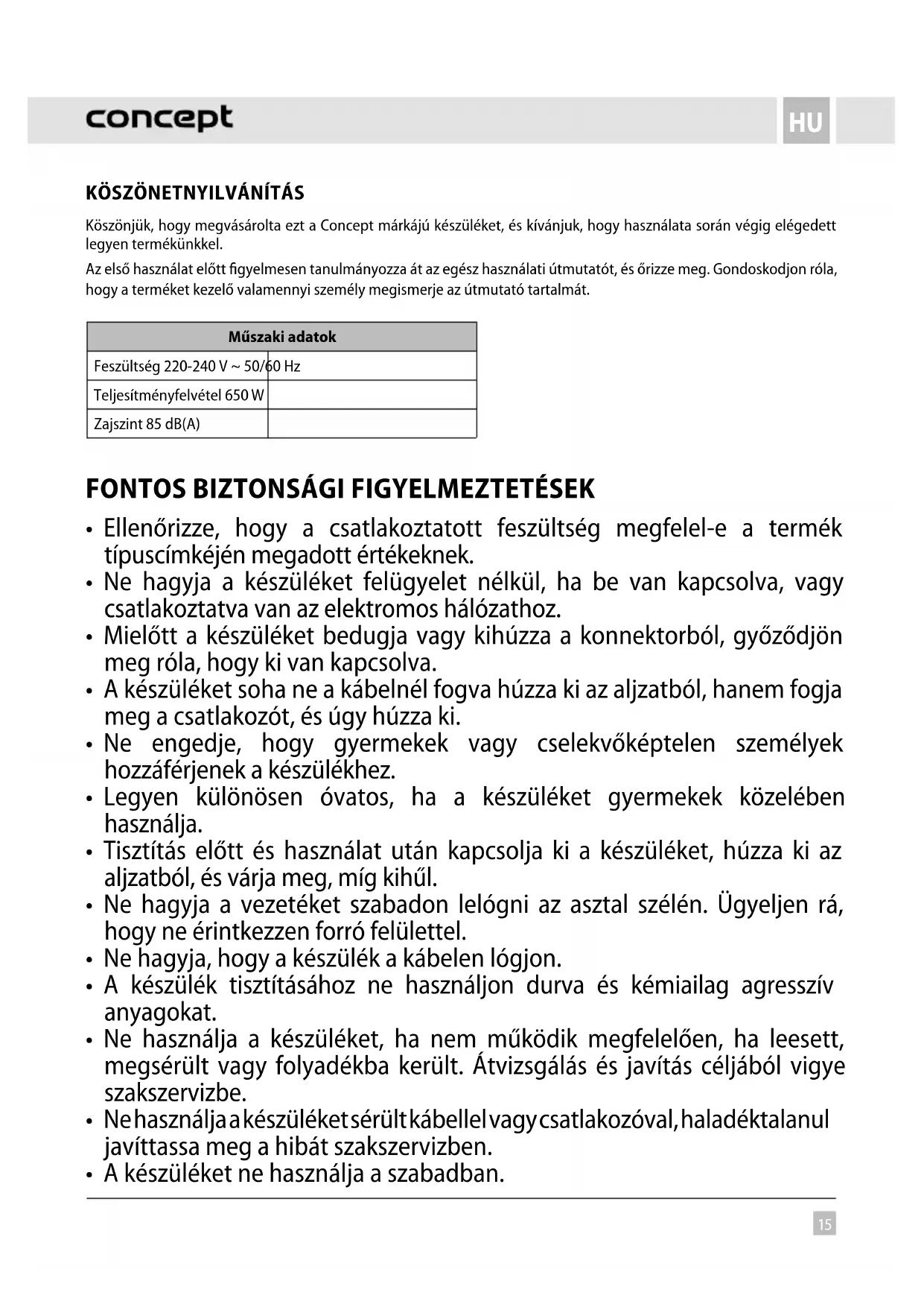Köszönjük, hogy megvásárolta ezt a Concept márkájú készüléket, és kívánjuk, hogy használata során végig elégedett legyen termékünkkel. Az első használat előtt figyelmesen tanulmányozza át az egész használati útmutatót, és őrizze meg. Gondoskodjon róla, hogy a terméket kezelő valamennyi személy megismerje az útmutató tartalmát. Műszaki adatok Feszültség 220-240 V ~ 50/60 Hz Teljesítményfelvétel 650 W Zajszint 85 dB(A)