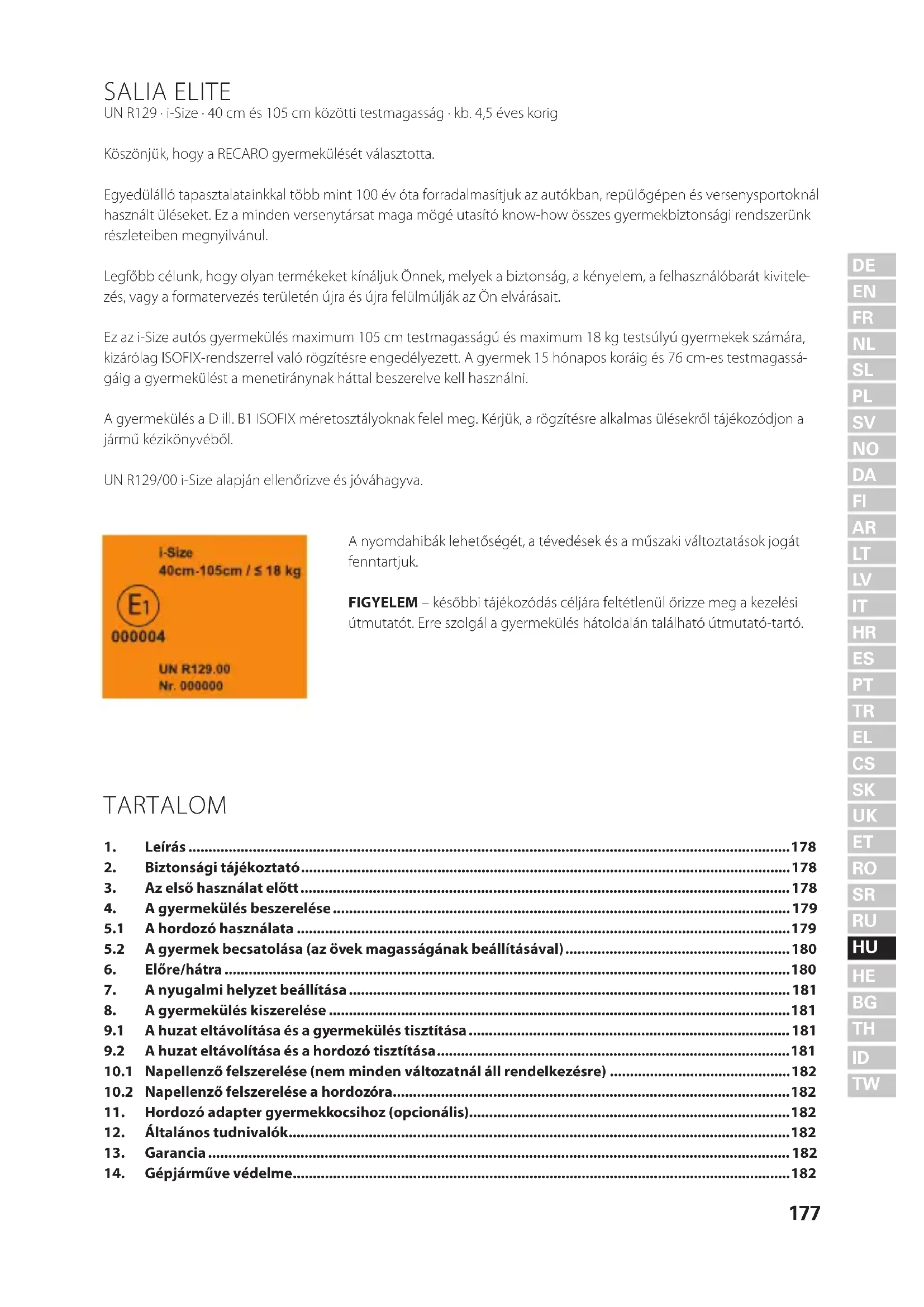 - gáig a gyermekülést a menetiránynak háttal beszerelve kell használni. A gyermekülés a D ill. B1 ISOFIX méretosztályoknak felel meg. Kérjük, a rögzítésre alkalmas ülésekről tájékozódjon a jármű kézikönyvéből. UN R129/00 i-Size alapján ellenőrizve és jóváhagyva. A nyomdahibák lehetőségét, a tévedések és a műszaki változtatások jogát fenntartjuk. FIGYELEM – későbbi tájékozódás céljára feltétlenül őrizze meg a kezelési útmutatót. Erre szolgál a gyermekülés hátoldalán található útmutató-tartó. TARTALOM 1. Leírás p. 178